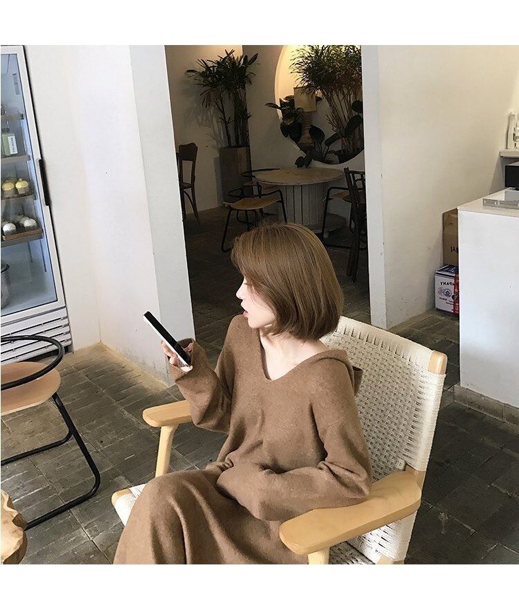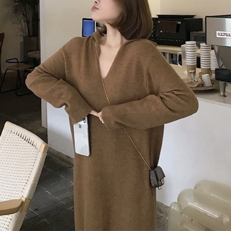 レディース ニットワンピース フード付き ロング丈 長袖 Vネック ゆったり オーバーサイズ フード ウエストマーク リラックス 大人可愛い おしゃれ こなれ感 上品 無地 秋 冬 20代 30代 40代 デート お出かけ 通勤 体型カバー 韓国 S M L XL 茶色 ブラウン グレー ローズレッド