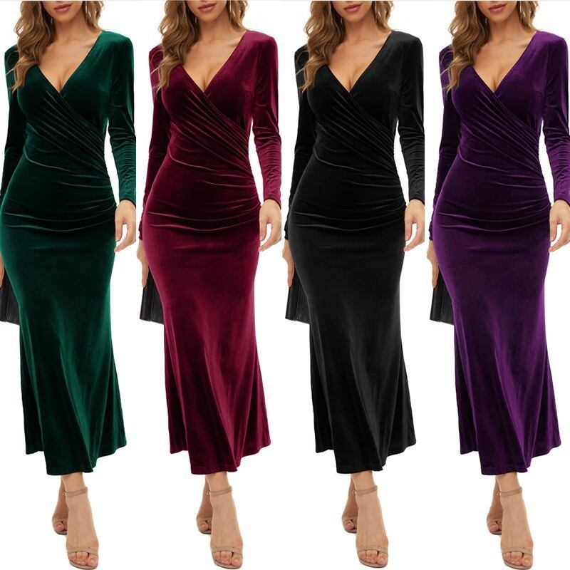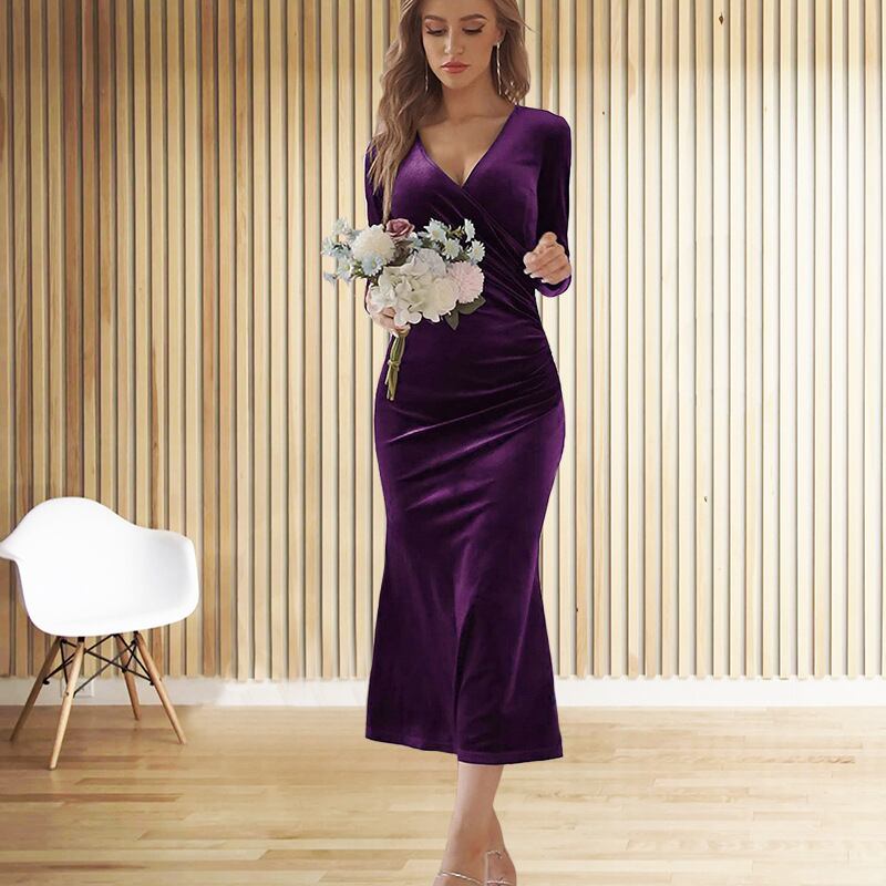 上品なベルベット素材のロングワンピース 深みのあるVネックとタイトシルエットが女性らしいラインを演出 秋冬のデートやお呼ばれシーンに映える一枚です
