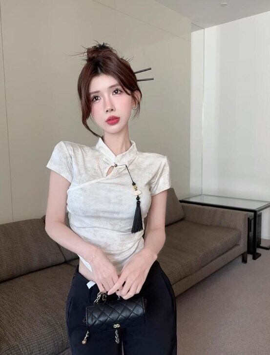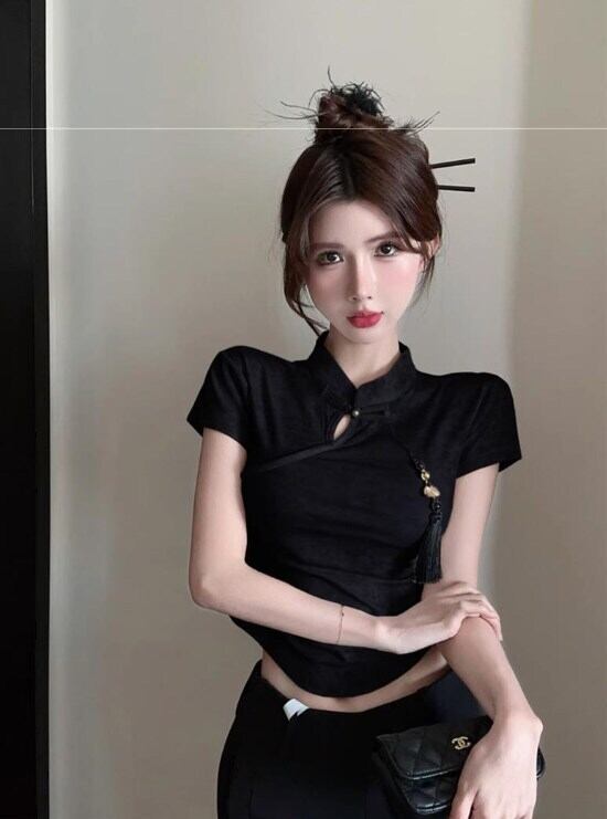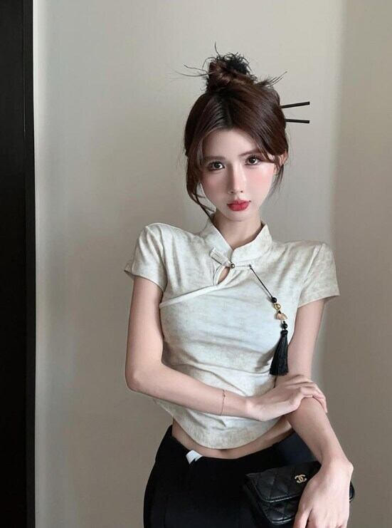 中国風デザインのスタンドカラーとタッセルボタンが上品な印象を演出するショート丈チャイナシャツ