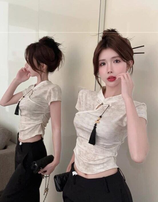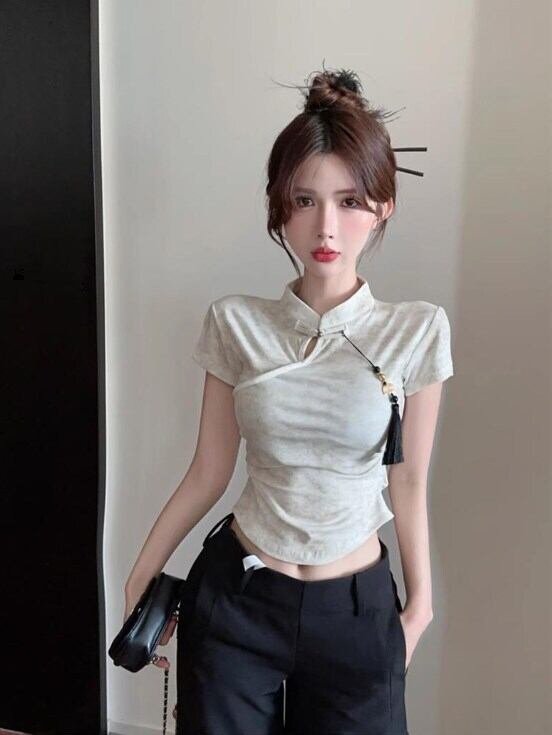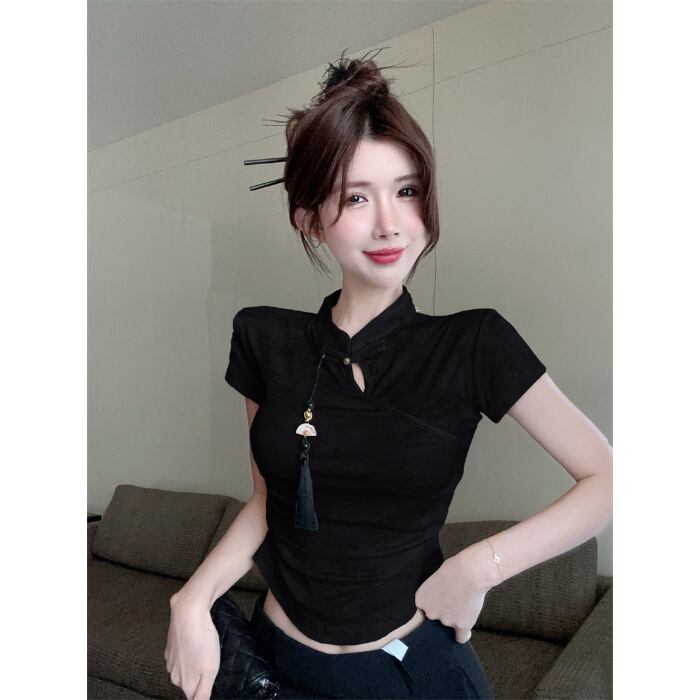 レディース トップス チャイナシャツ ショート丈 半袖 スタンドカラー タイト チャイナボタン タッセル装飾 ウエストシェイプ 大人可愛い きれいめ 上品 こなれ感 無地 春 夏 20代 30代 デート お出かけ 女子会 中国風 S M L XL ホワイト 白 ブラック 黒 カーキ