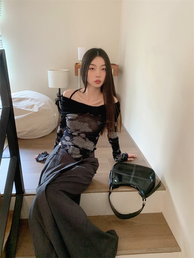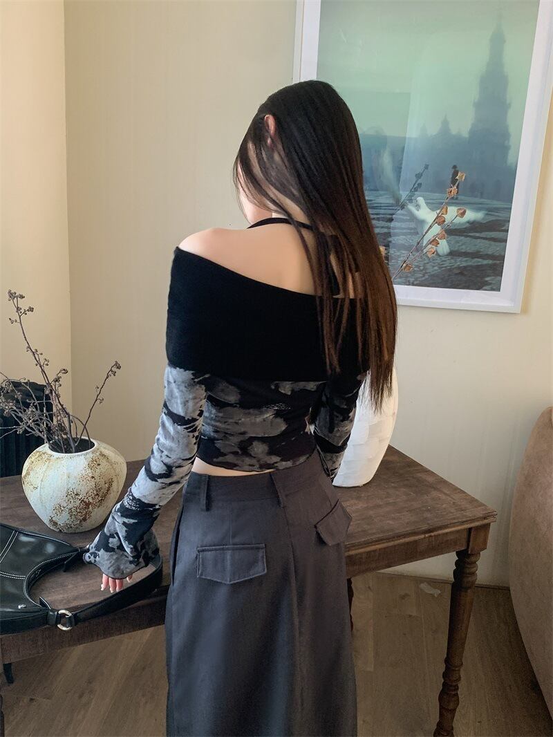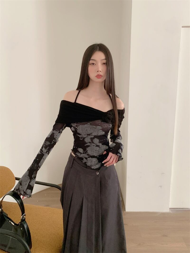 オフショルダーとストラップを組み合わせたデザインが独特の存在感を放つショート丈トップス