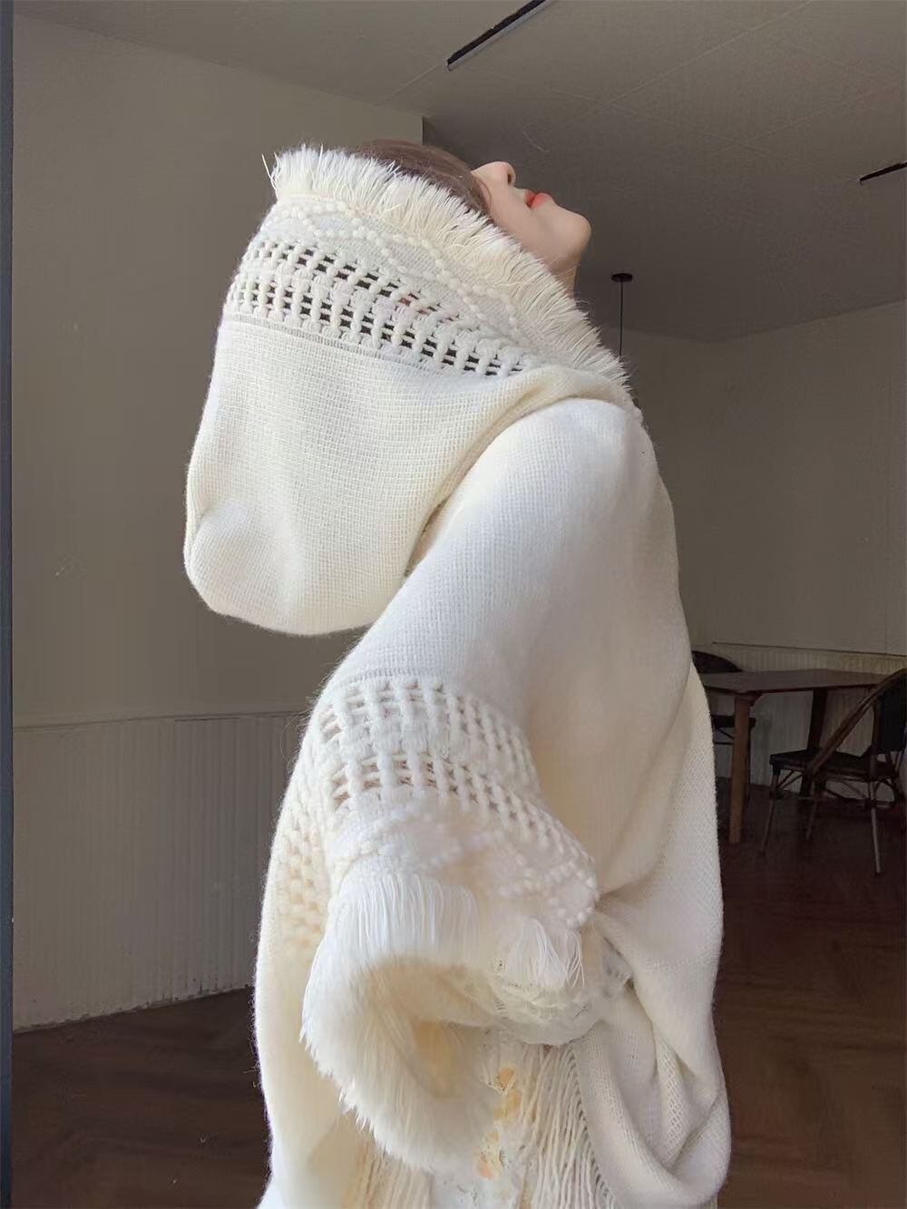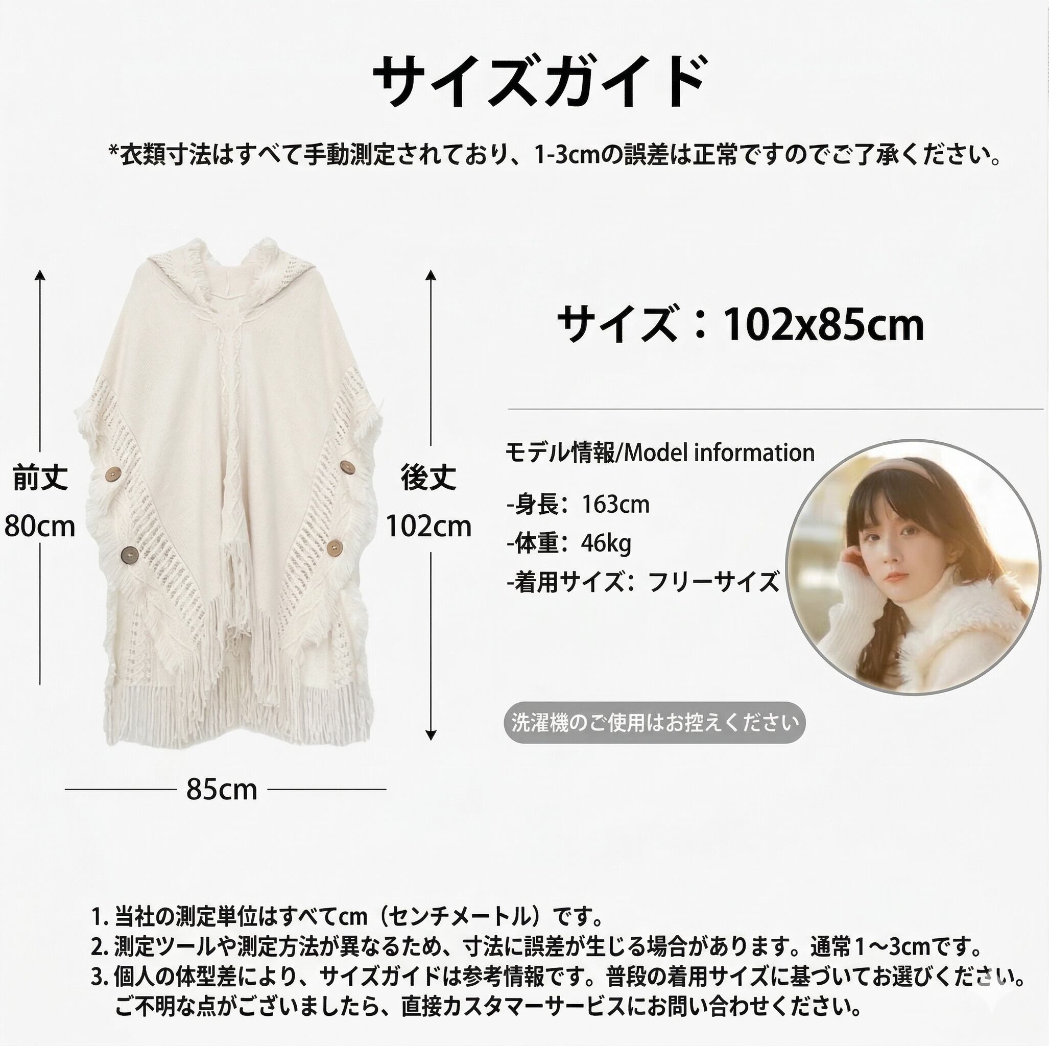 やわらかなフリンジとジャカード編みが美しいフード付きポンチョ。前丈80cm 後丈102cmのゆったりシルエットが体型を美しくカバーします。ベージュ ミルクホワイトの2色展開で秋冬のお出かけやデートに最適な一枚です。