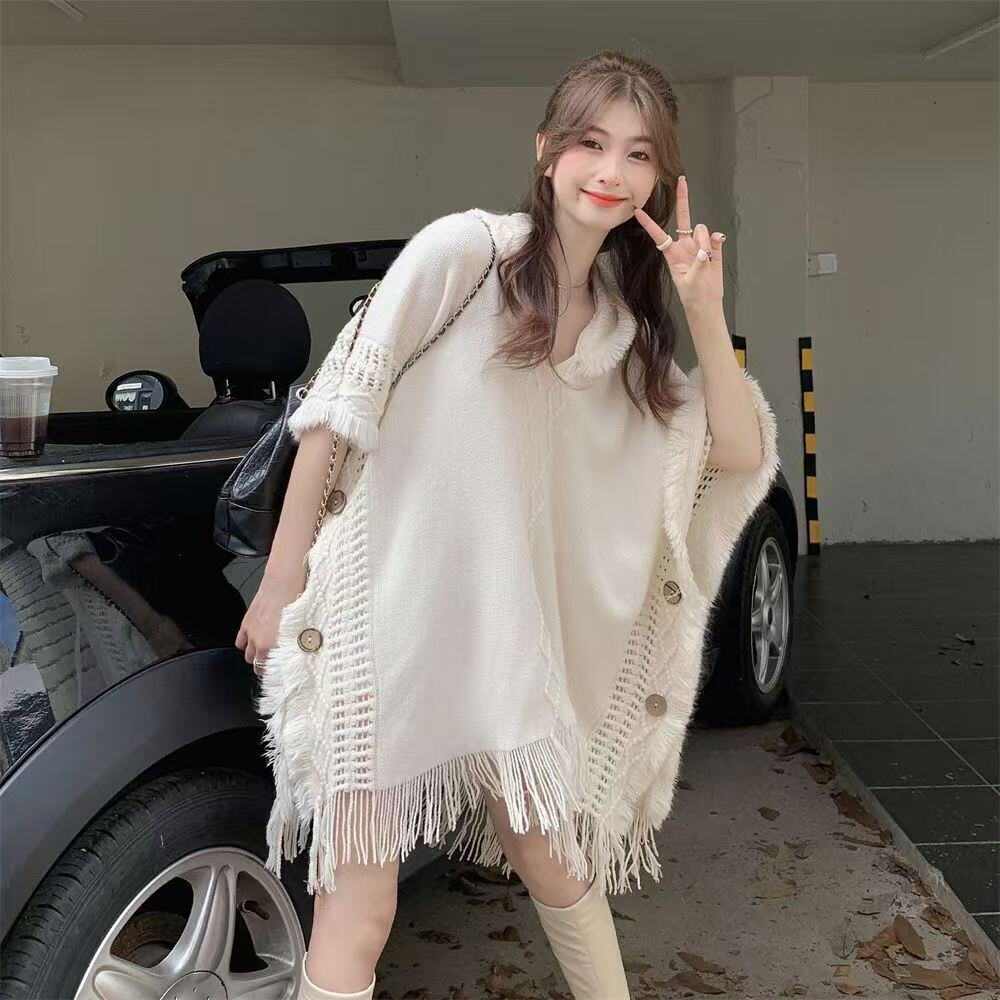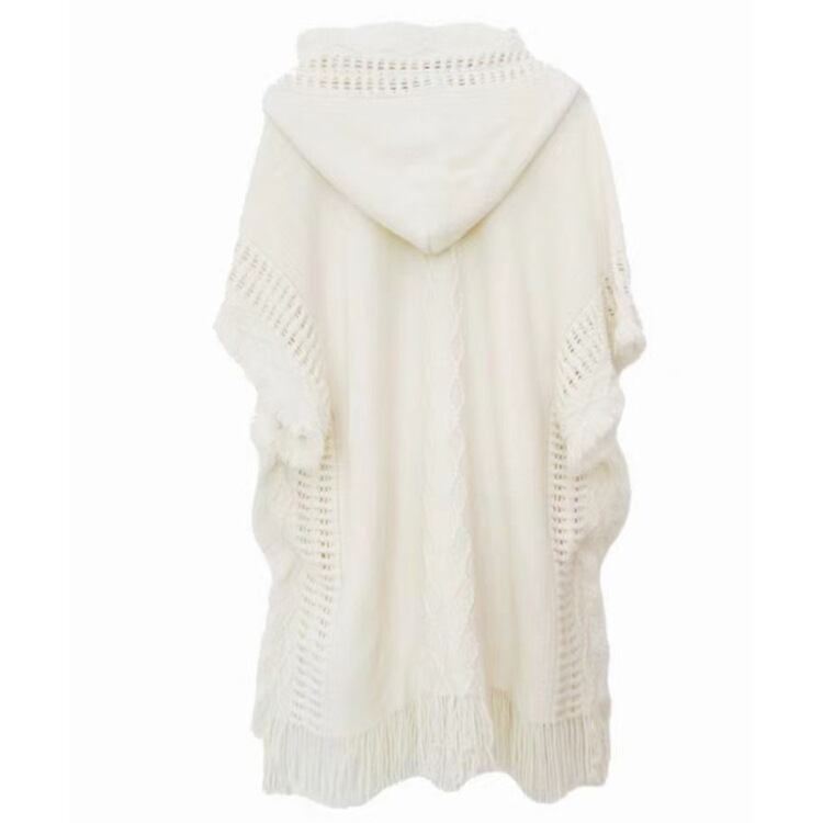 レディース ポンチョ ケープ ショール マント ロング 長袖 フード付き フリンジ ボタン ジャカード編み ニット ポリエステル かわいい 上品 大人可愛い おしゃれ 無地 秋 冬 20代 30代 40代 デート お出かけ 女子会 体型カバー フリーサイズ ベージュ ミルクホワイト 白