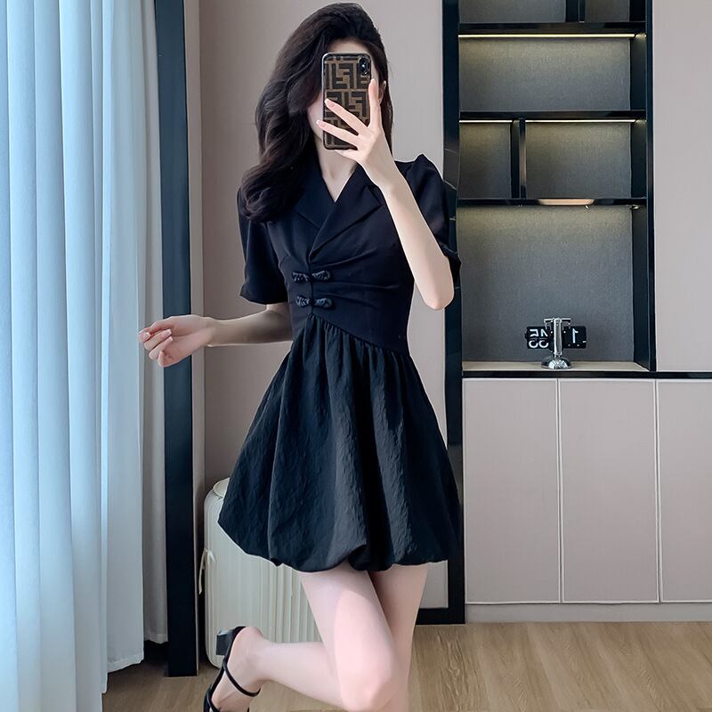 レディース ワンピース シャツワンピ フレアワンピ ミニ 半袖 Vネック Aライン ウエストマーク ボタン 中国風 きれいめ 大人可愛い エレガント 上品 無地 春 夏 20代 30代 デート お出かけ 女子会 ウエストシェイプ 体型カバー S M L XL 黒 ブラック