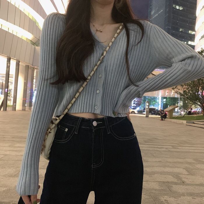 上品なVネックデザインとリブ素材が女性らしいシルエットを演出するショート丈カーディガン