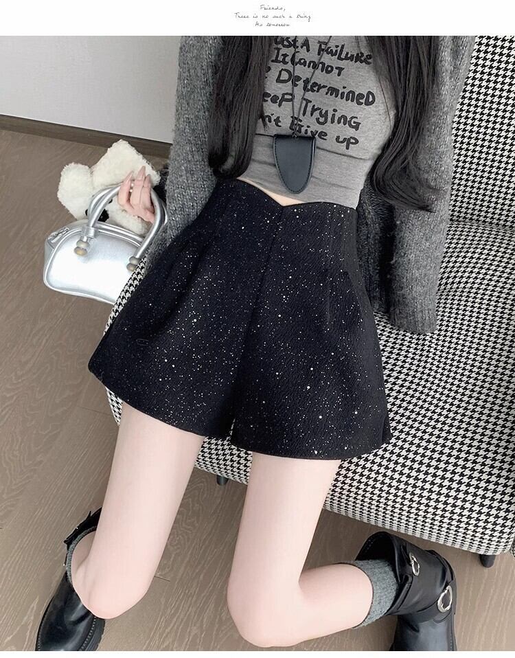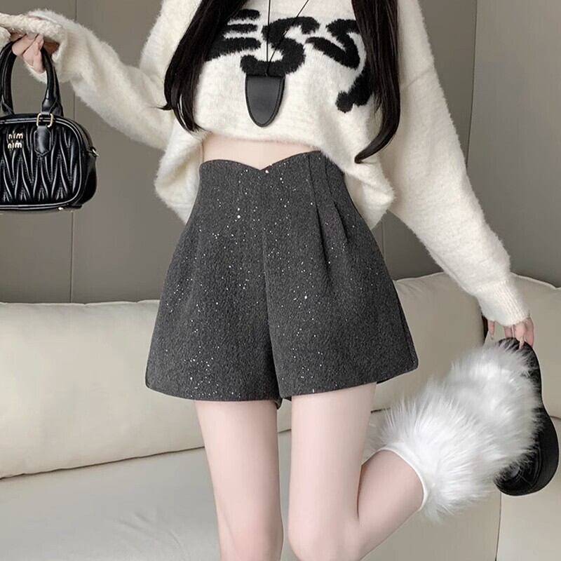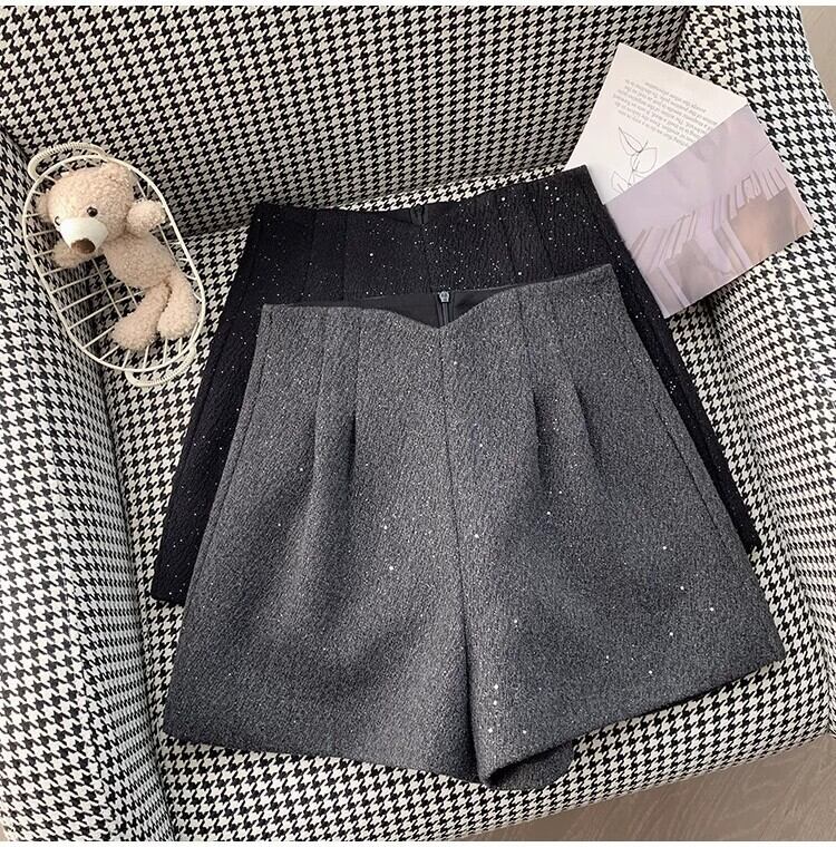 レディース ショートパンツ ショート丈 ハイウエスト フレア スパンコール かわいい おしゃれ 大人可愛い きれいめ 無地 秋 冬 20代 30代 デート お出かけ 女子会 韓国 ウエストシェイプ 体型カバー XS S M L XL 2XL 3XL 4XL グレー ブラック