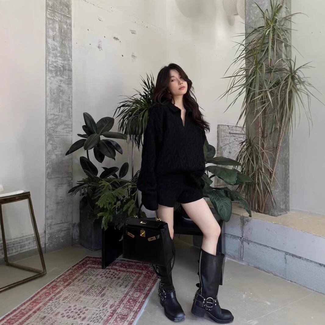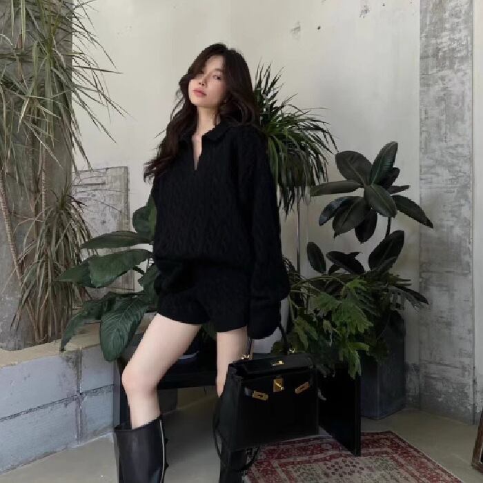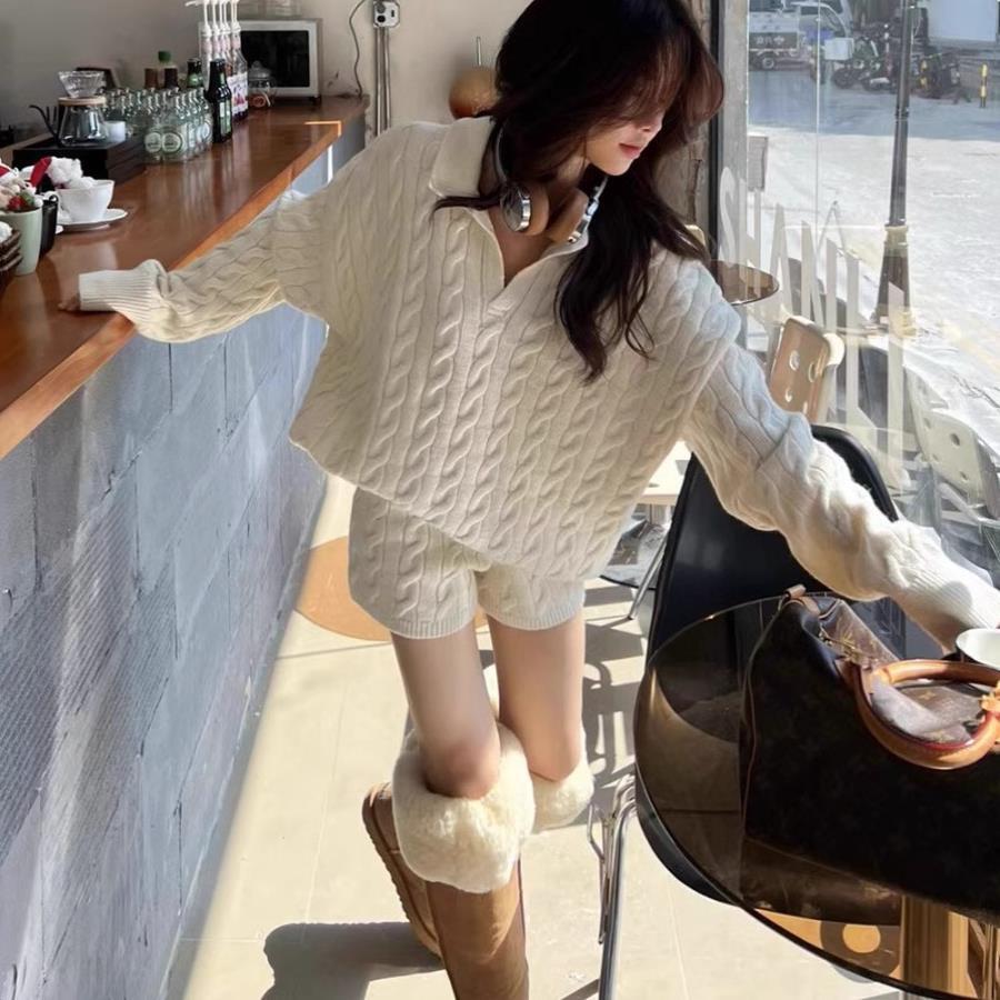 ケーブル編みニットトップスとショートパンツの上下セット
