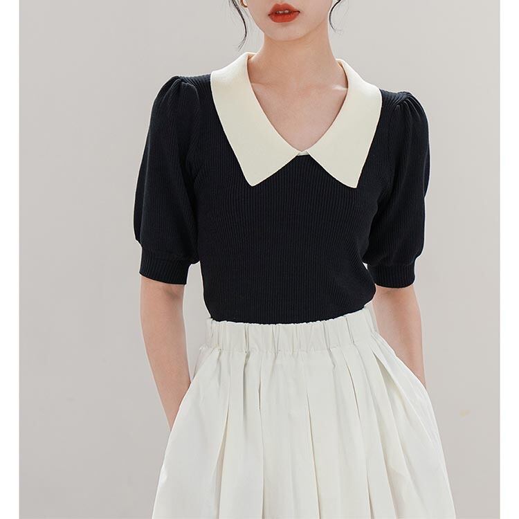 レディース トップス ニット ショート丈 半袖 大きめ襟 フラットカラー スリム フィット ツートーン カラーブロック 大人可愛い エレガント きれいめ おしゃれ 無地 春 秋 20代 30代 40代 デート お出かけ 女子会 ウエストシェイプ S M L グリーン 緑 ブラック 黒 オフホワイト アイボリー