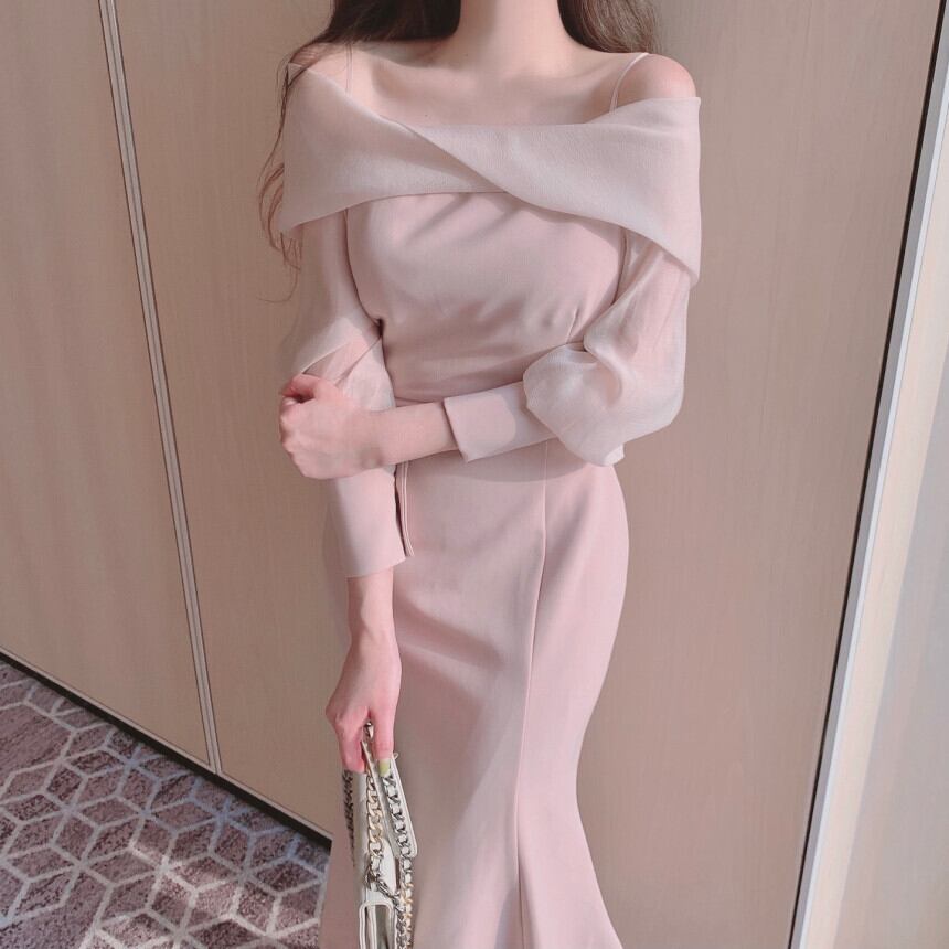 レディース ワンピース フィッシュテールスカート ロング 長袖 オフショルダー タイト フレア ウエストシェイプ フリル ドレープ エレガント 上品 きれいめ 大人可愛い 無地 秋 冬 20代 30代 40代 デート お呼ばれ お出かけ 韓国 体型カバー S M ブラック クロ アイボリー オフホワイト ピンク