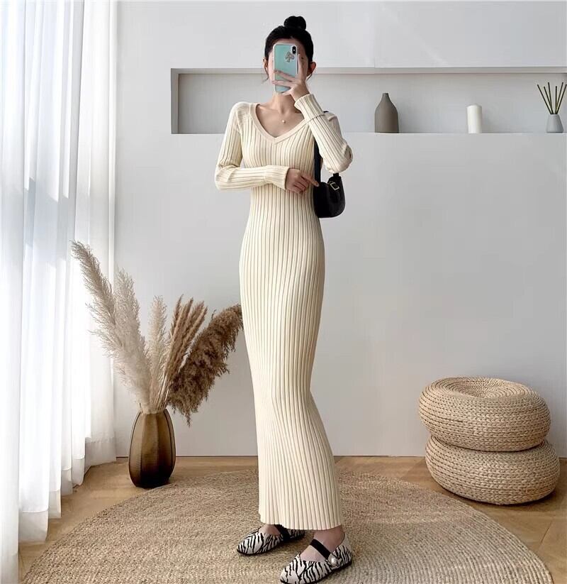 レディース ワンピース ニットワンピ ロング 長袖 Vネック タイト リブ編み ウエストシェイプ ストレッチ ニット きれいめ 大人可愛い エレガント 上品 無地 秋 冬 20代 30代 40代 デート 通勤 お出かけ 体型カバー 韓国 S M L XL オフホワイト ホワイト 黒 ブラック