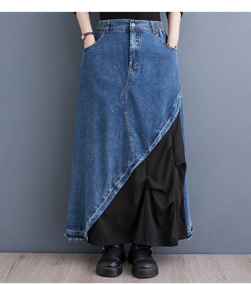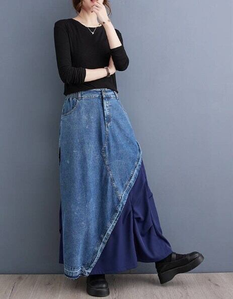 レディース スカート デニムスカート フレアスカート ロング Aライン フレア バイカラー 切り替え ウエストゴム エレガント 上品 おしゃれ 大人可愛い 無地 春 秋 冬 20代 30代 40代 デート お出かけ 通勤 体型カバー こなれ感 フリーサイズ ブラック クロ 青 ブルー