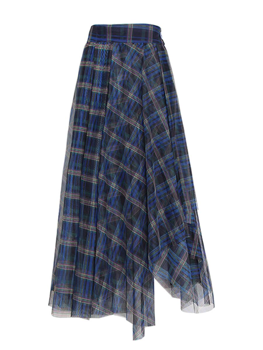 レディース スカート フレア ミディアムスカート ロング 長袖なし ハイウエスト フレア チェック柄 メッシュ チュール ウエストマーク 上品 きれいめ エレガント 大人可愛い チェック 春 秋 20代 30代 40代 デート お出かけ 通勤 体型カバー ウエストシェイプ S M L XL 青 ネイビー