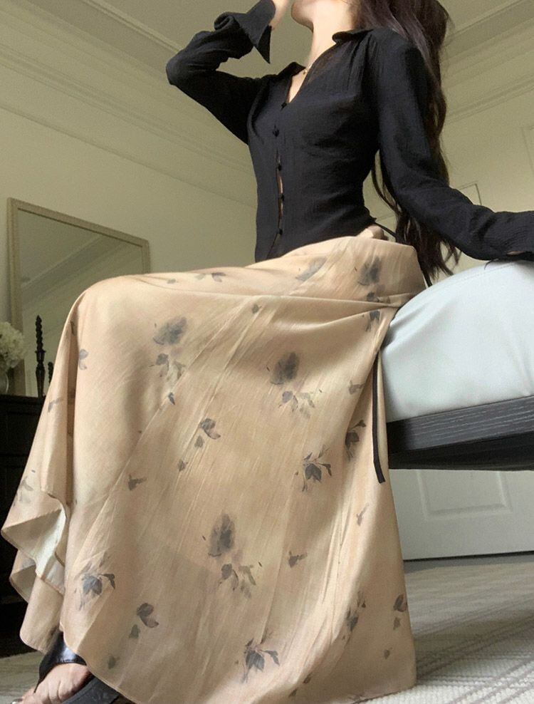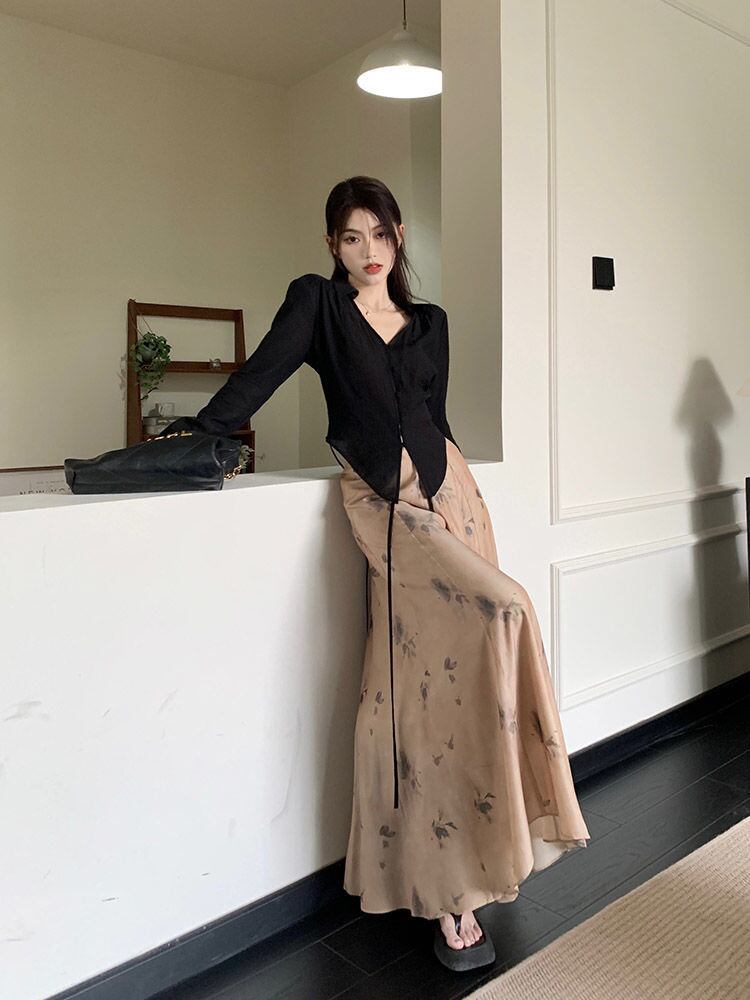 レディース セットアップ シャツ ワイドパンツ ツーピース ロング 長袖 Vネック ワイド フレア 花柄 ボタン ウエストマーク 大人可愛い きれいめ エレガント 上品 花柄 春 秋 20代 30代 40代 デート お出かけ 通勤 韓国 体型カバー セット S M L XL ブラック アイボリー