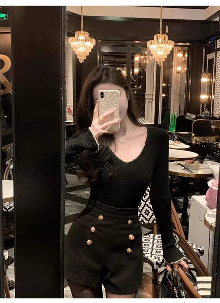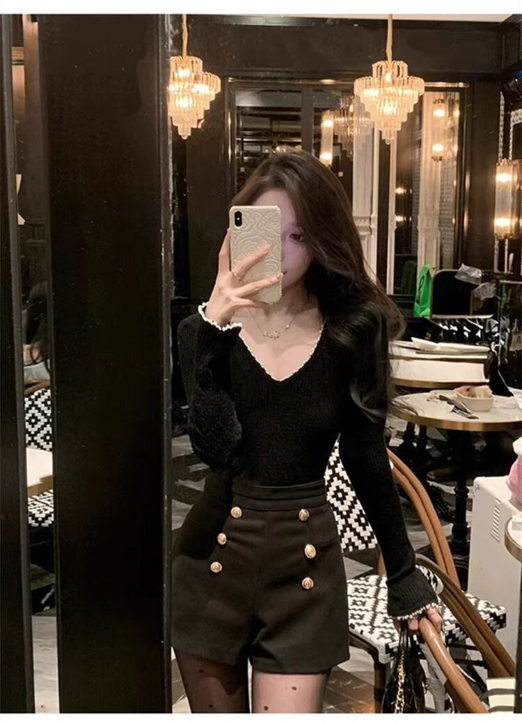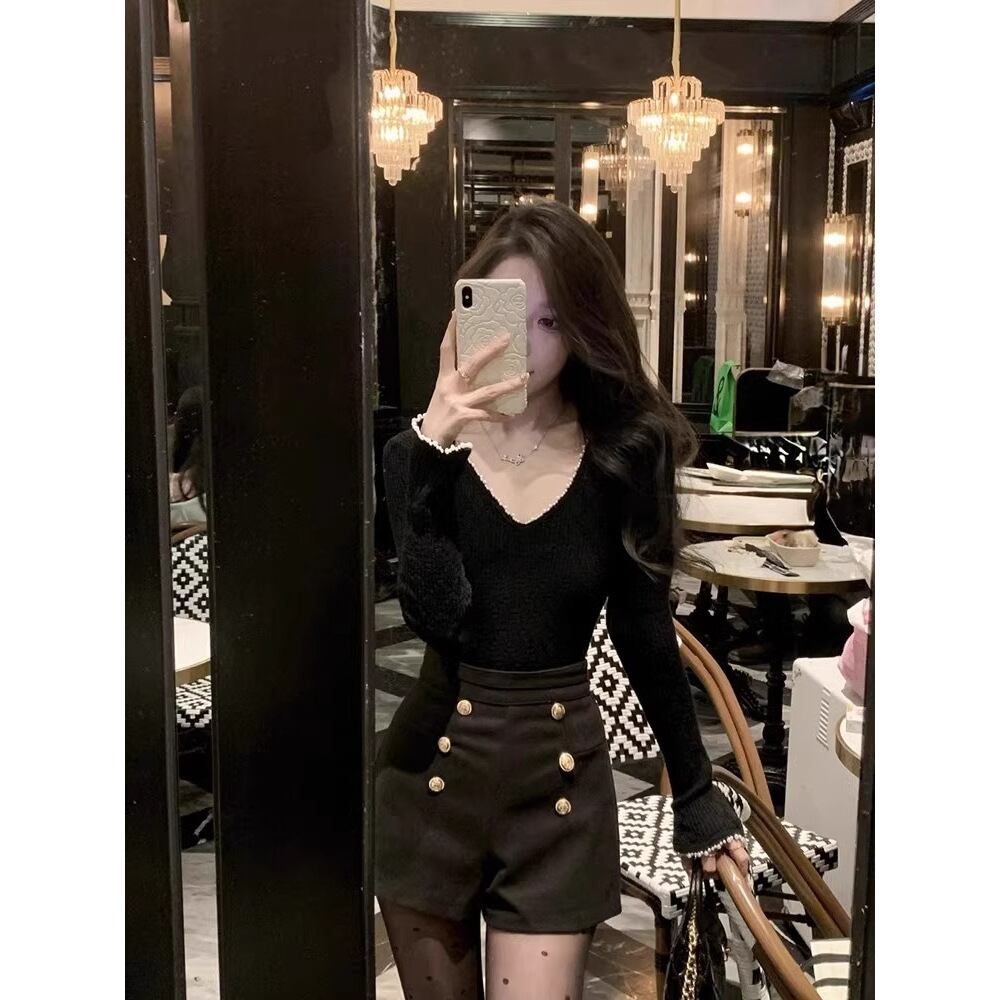 レディース トップス ニット ショート丈 長袖 Vネック スリム フィット ニット素材 大人可愛い きれいめ おしゃれ 上品 無地 秋 冬 20代 30代 40代 デート お出かけ 通勤 韓国 体型カバー S M L XL 白 ホワイト 黒 ブラック