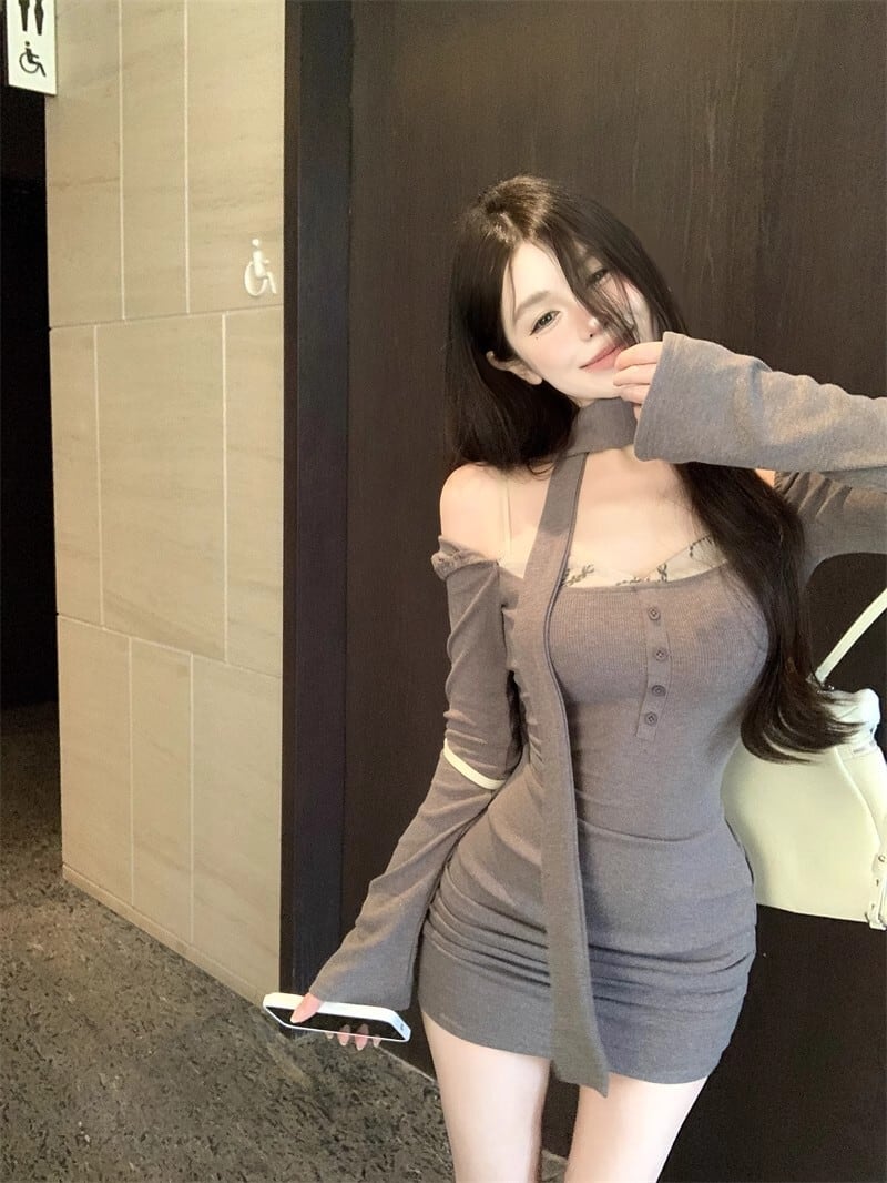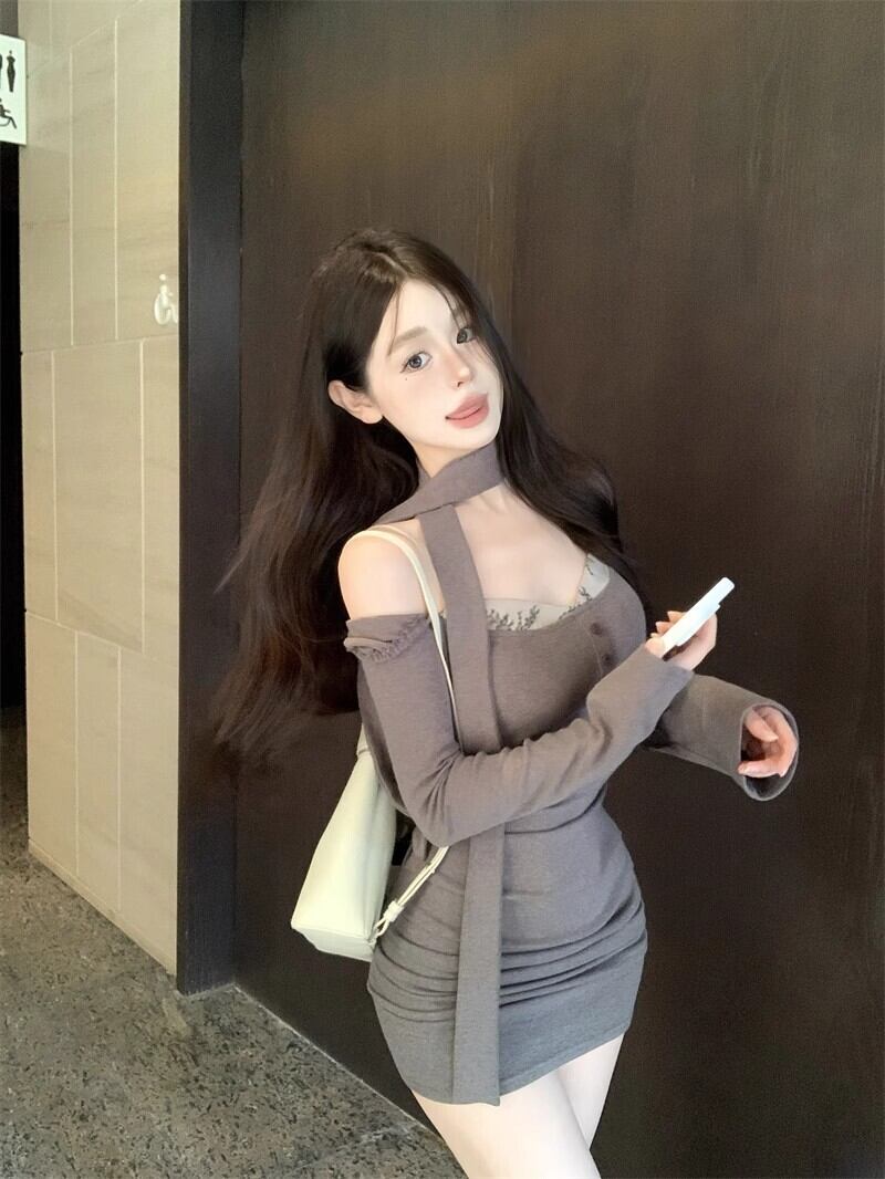 グレーのニット素材を使用したセクシーなカットアウトデザインのミニワンピース