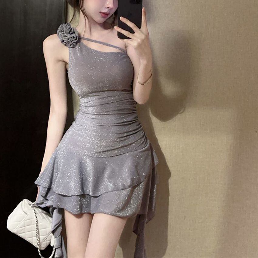 レディース ワンピース ミニワンピ ミニ 袖なし ワンショルダー タイト フリル グリッター スパンコール きれいめ 大人可愛い セクシー エレガント 無地 春 夏 20代 30代 デート 女子会 お出かけ ウエストシェイプ S M L グレー 紫 グレーパープル
