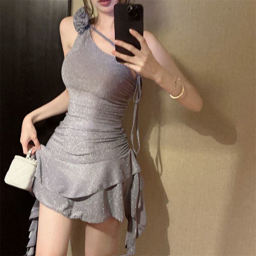 キラキラ輝くグリッター素材が華やかな印象を演出するワンショルダーミニドレス フリルとウエストシェイプで女性らしいシルエットに仕上げました タイ 東南アジアテイストのセクシーでエレガントなデザインが特別なシーンを彩ります