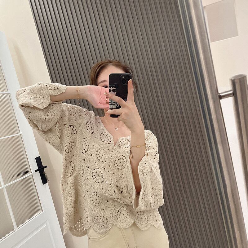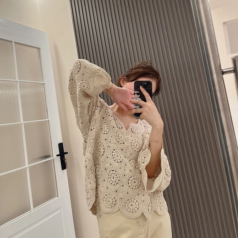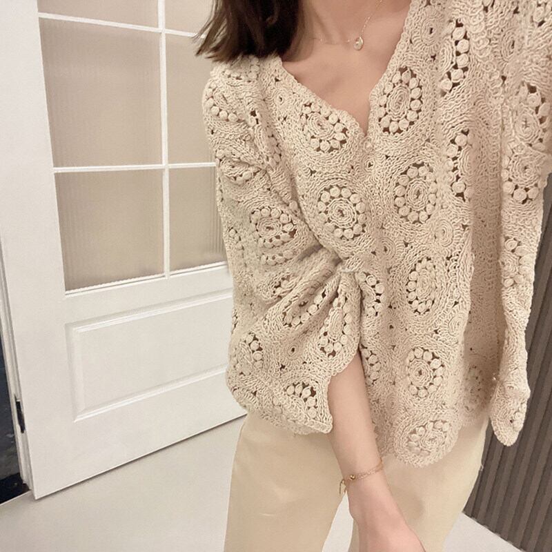 レディース トップス ニット カーディガン ショート丈 長袖 Vネック ルーズ レース 透かし編み フラワー 花柄刺繍 大人可愛い エレガント 上品 おしゃれ 花柄 春 秋 20代 30代 40代 デート お出かけ 女子会 体型カバー ゆったり ワンサイズ アイボリー アプリコット