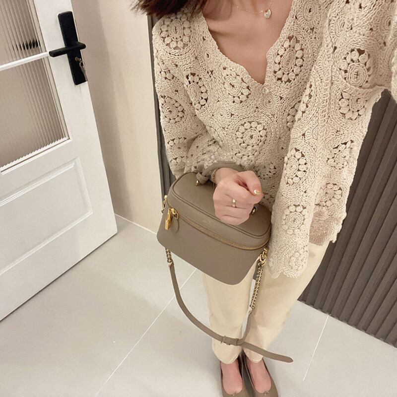 透かし編みの繊細な花柄が上品な印象を与えるニットカーディガン
