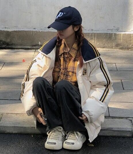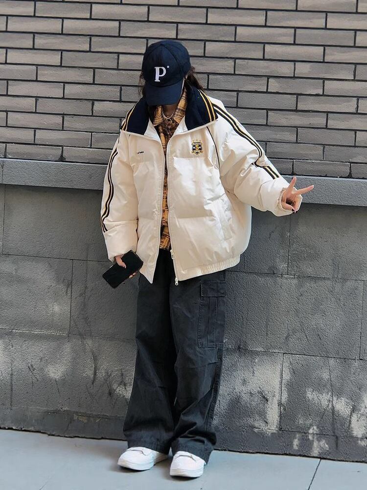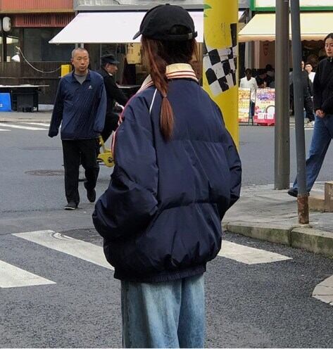 ストライプ切り替えとスタンドカラーがおしゃれなオーバーサイズシルエット