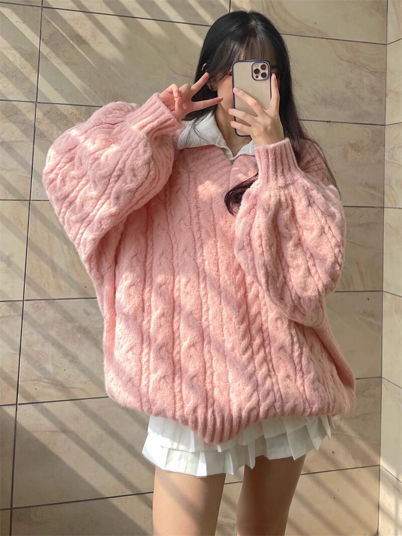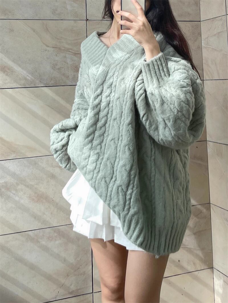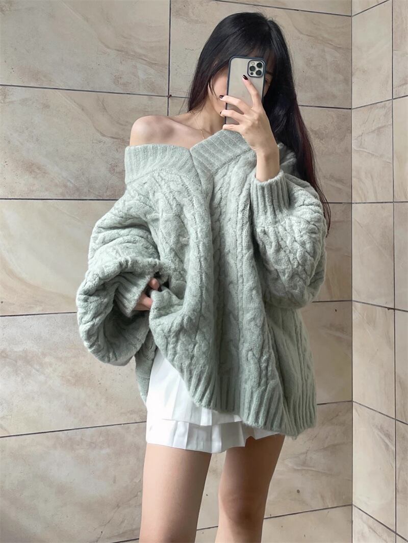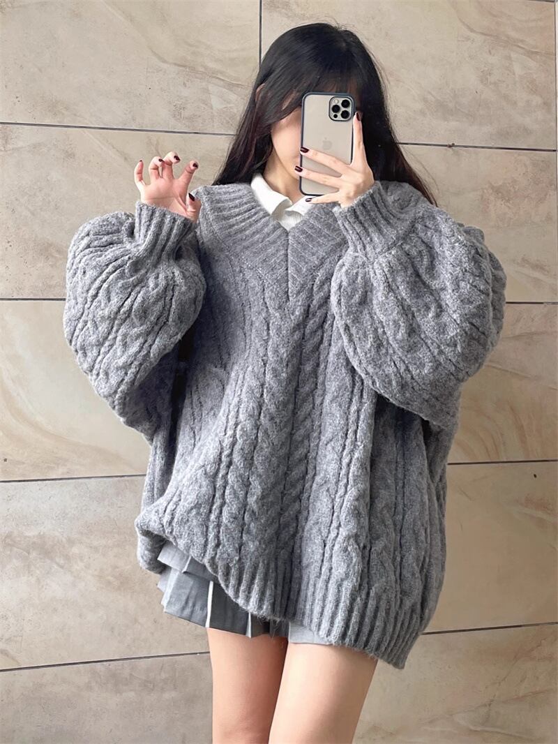 レディース トップス ニットセーター ロング 長袖 Vネック オーバーサイズ ゆったり ケーブル編み プルオーバー ランタンスリーブ ニット 大人可愛い おしゃれ こなれ感 上品 無地 秋 冬 20代 30代 デート お出かけ 女子会 韓国 体型カバー ワンサイズ 色 グレー ピンク 緑 グリーン カーキ