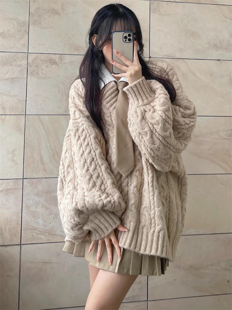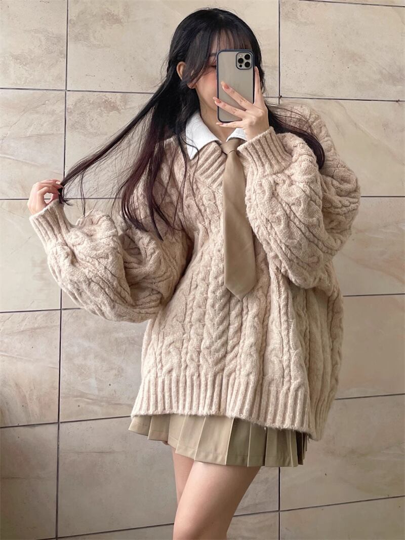 たっぷりとしたオーバーサイズシルエットが今っぽい印象のVネックケーブル編みニットセーター