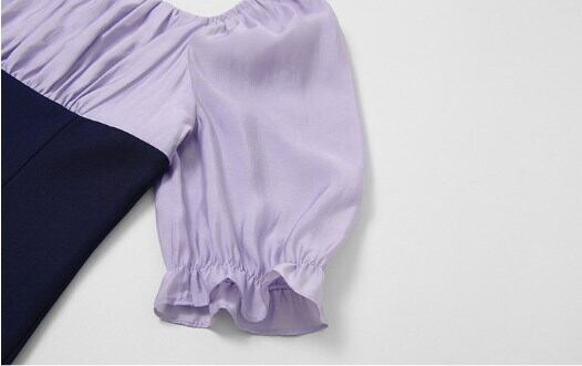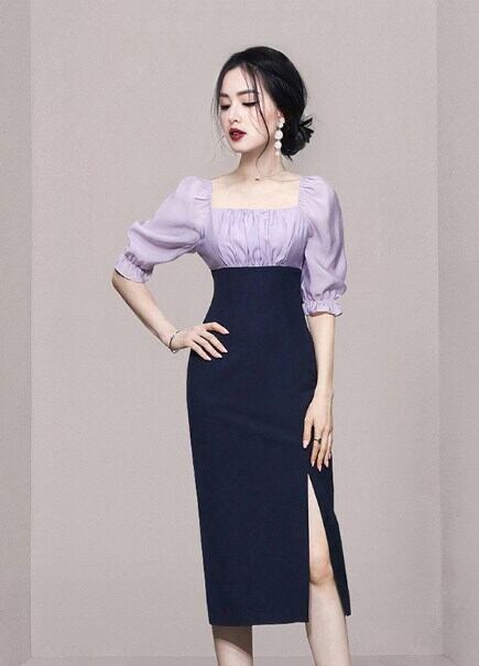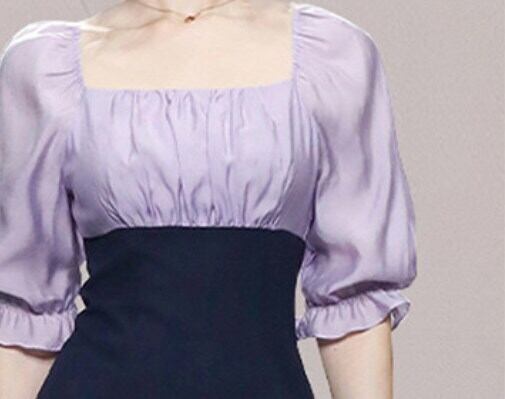 レディース ワンピース ミディスカート ミモレ丈 バブルスリーブ スクエアネック タイト コントラストカラー 切り替え ウエストマーク きれいめ 上品 エレガント 大人可愛い 無地 春 夏 20代 30代 40代 デート お出かけ 通勤 体型カバー ウエストシェイプ S M L XL 紫 パープル 緑 グリーン