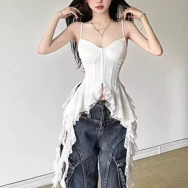 レディース トップス キャミソール ショート丈 袖なし スパゲッティストラップ フレア レース フリル ショルダーストラップ 大人可愛い きれいめ おしゃれ エレガント 無地 オールシーズン 20代 30代 デート お出かけ 女子会 韓国 ウエストシェイプ フリーサイズ 白 ホワイト 黒 ブラック
