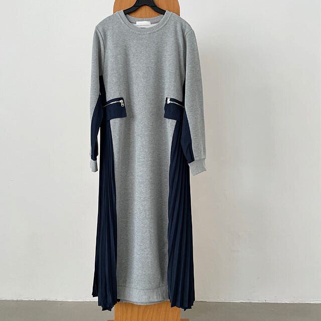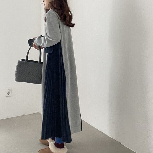 レディース ワンピース プリーツスカート付き ロング 長袖 ラウンドネック Aライン ツーピース風 配色切り替え プリーツ ポリエステル きれいめ 上品 大人可愛い おしゃれ 無地 秋 冬 春 20代 30代 40代 オフィス 通勤 デート お出かけ 女子会 ショッピング 韓国 着回し トレンド ワンサイズ グレー 黒 ブラック