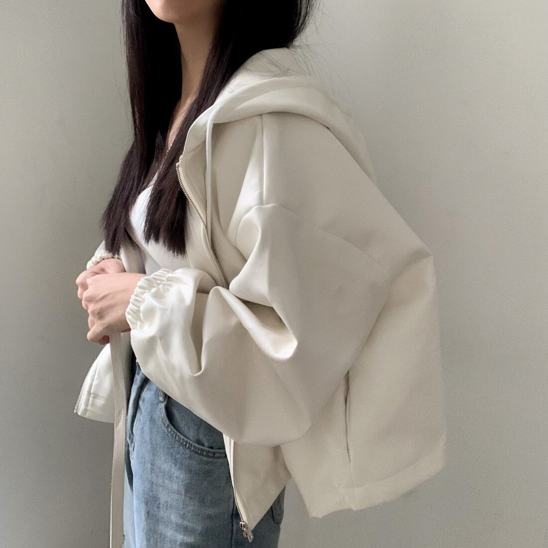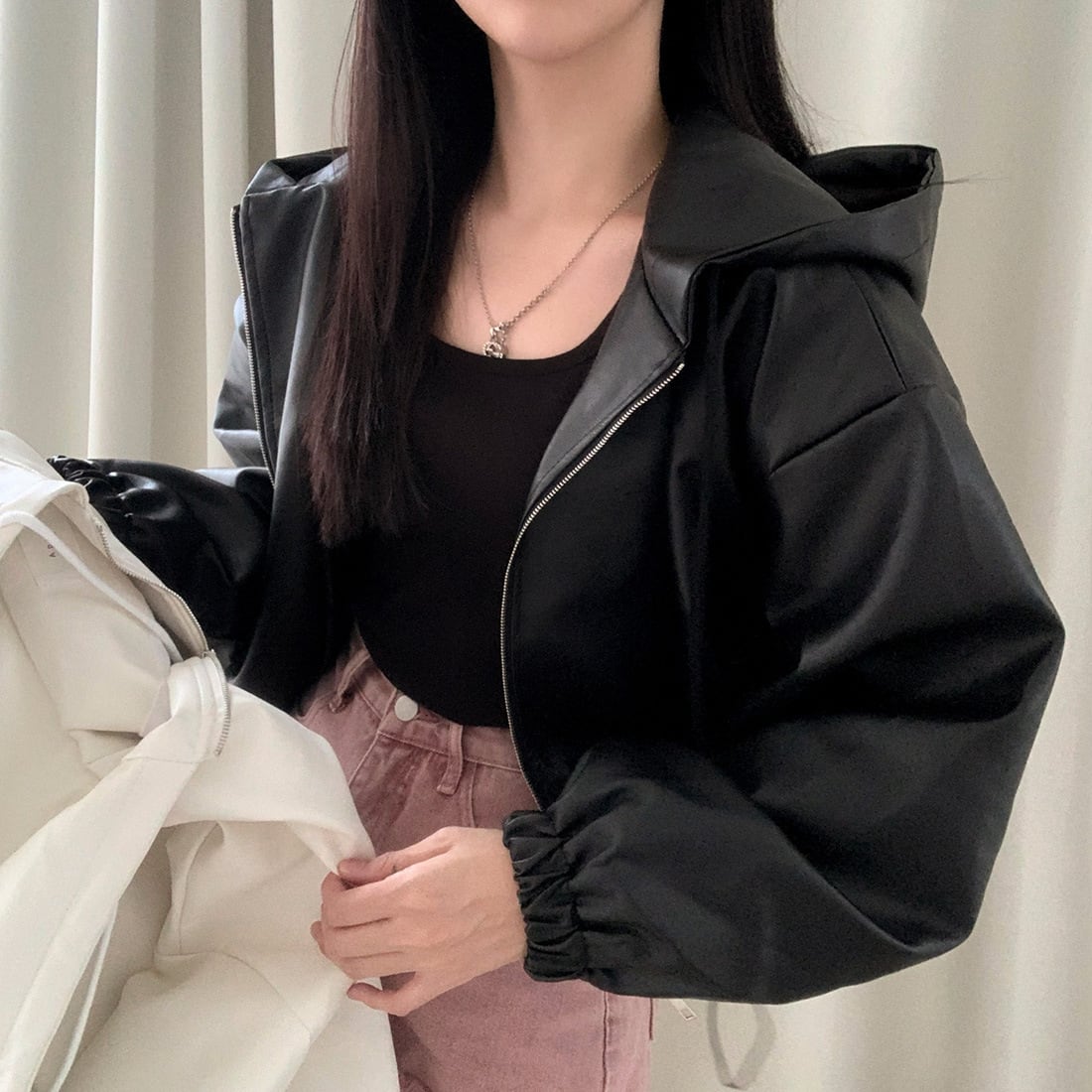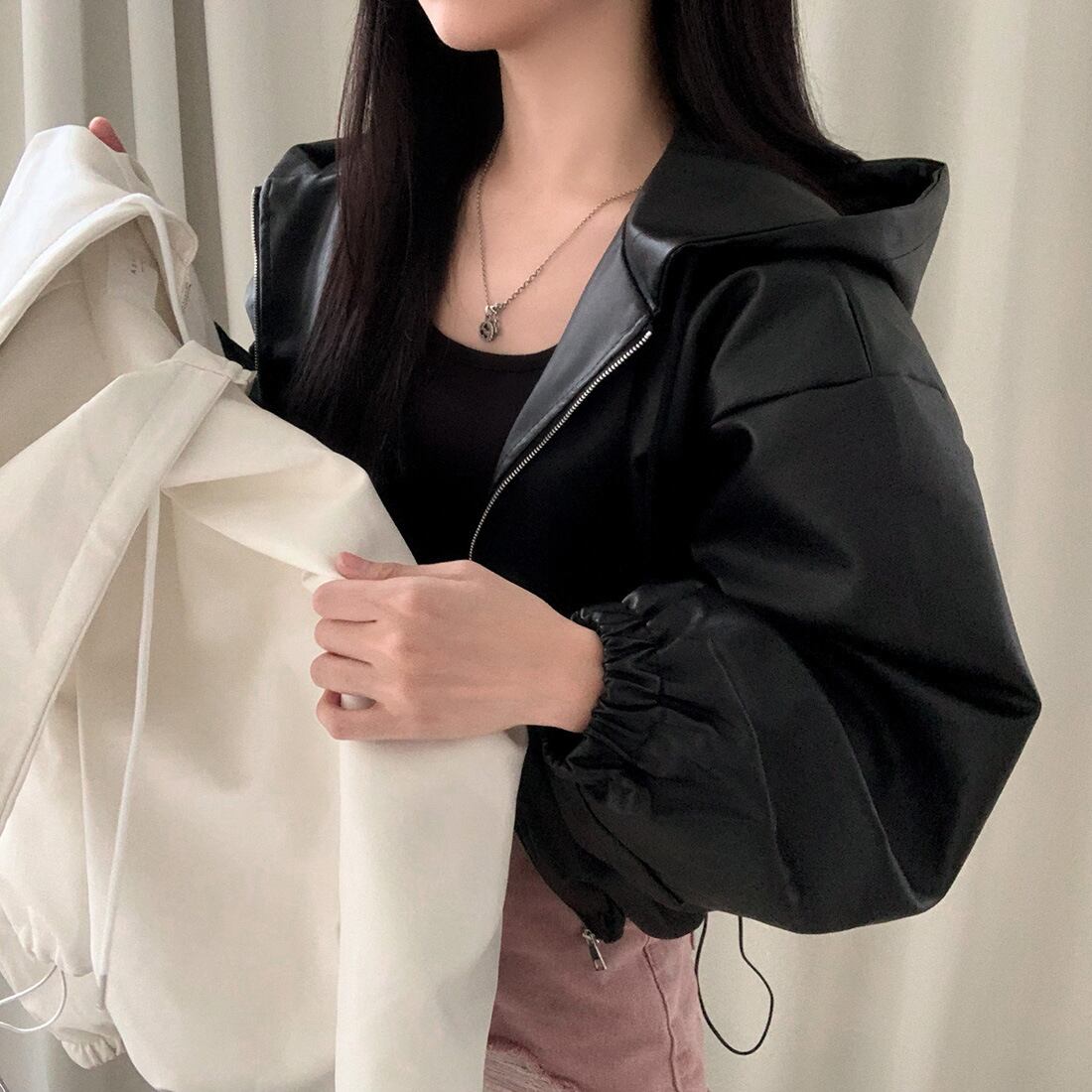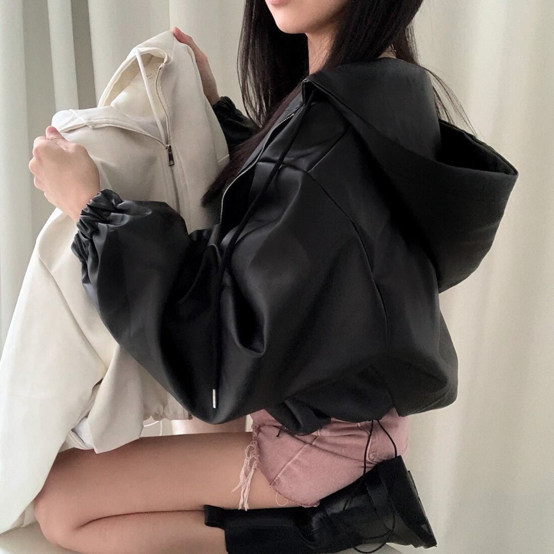 レディース ジャケット アウター ショート丈 長袖 フード付き レザージャケット フーデッド ジップアップ ルーズ ゆったり 合皮 フェイクレザー おしゃれ きれいめ 大人可愛い トレンド 無地 春 秋 20代 30代 40代 デート お出かけ ショッピング 女子会 韓国 着回し オルチャン ワンサイズ 黒 ブラック 白 ホワイト