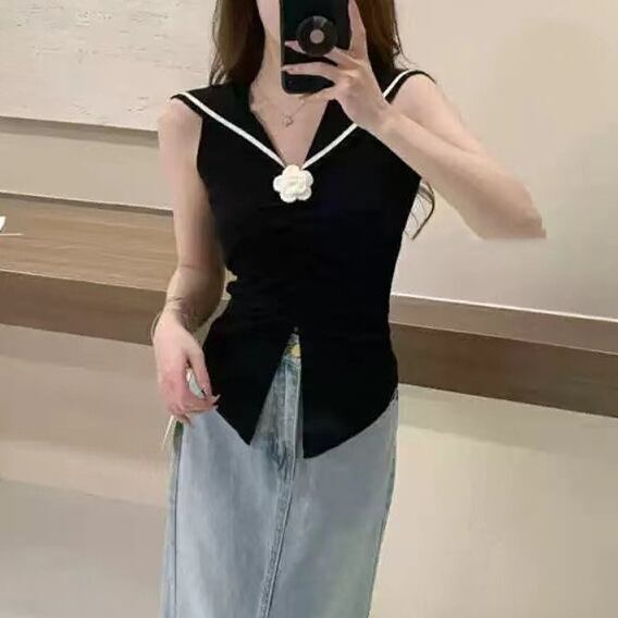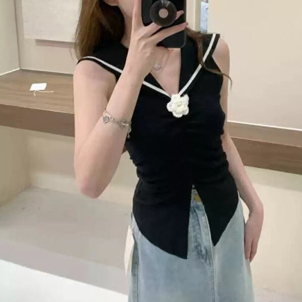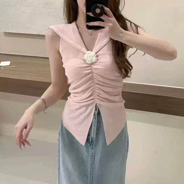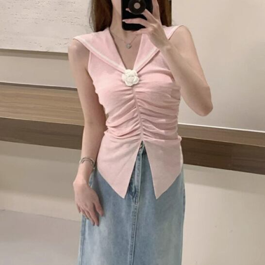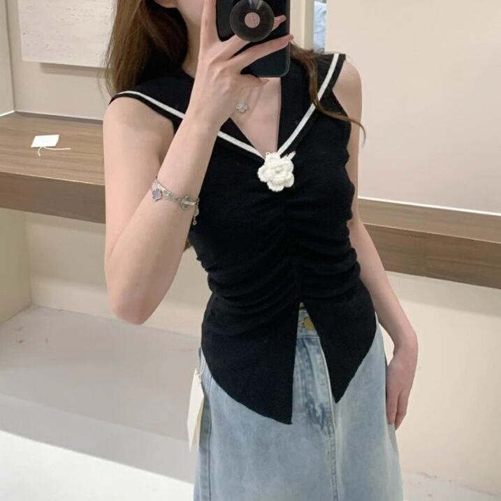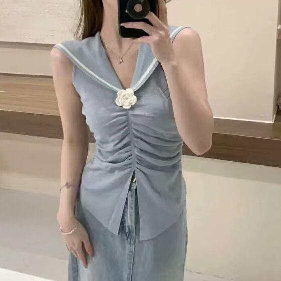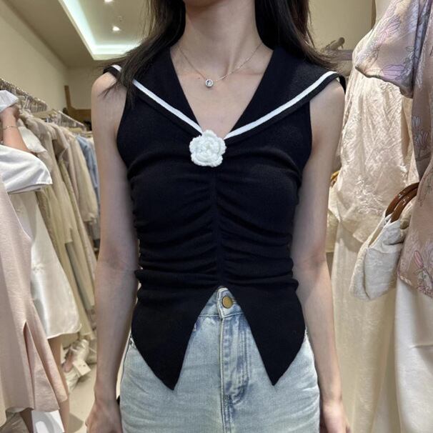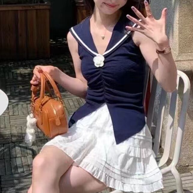 レディース トップス ニットベスト ショート丈 袖なし セーラーカラー タイト セーラー襟 花飾り ギャザー ウエストマーク ニット 大人可愛い きれいめ おしゃれ 上品 無地 夏 春 20代 30代 デート お出かけ カフェ 女子会 韓国 トレンド インスタ映え 着回し ワンサイズ 白 ホワイト 黒 ブラック アイボリー ロイヤルブルー スカイブルー ピンク