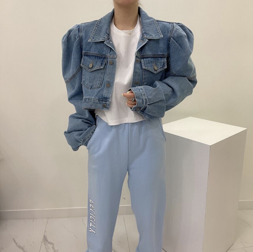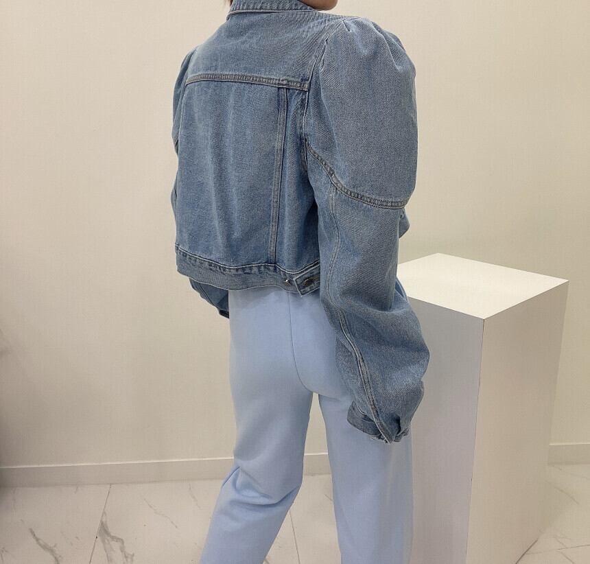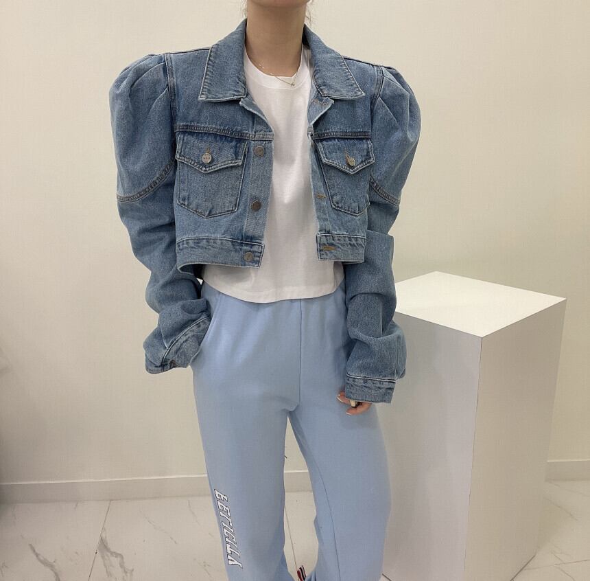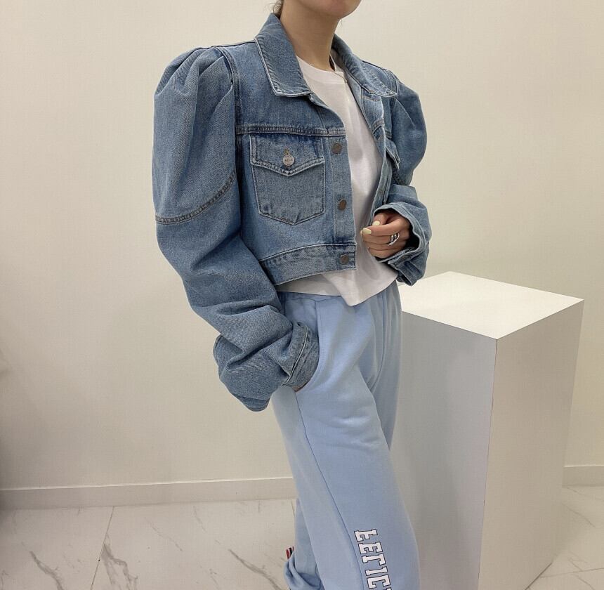 レディース トップス デニムジャケット ショート丈 長袖 オーバーサイズ パフスリーブ ボタン ポケット付き コットン デニム かわいい おしゃれ こなれ感 大人可愛い 無地 春 秋 20代 30代 デート お出かけ ショッピング カフェ 韓国 オルチャン トレンド 着回し ワンサイズ 青 ブルー