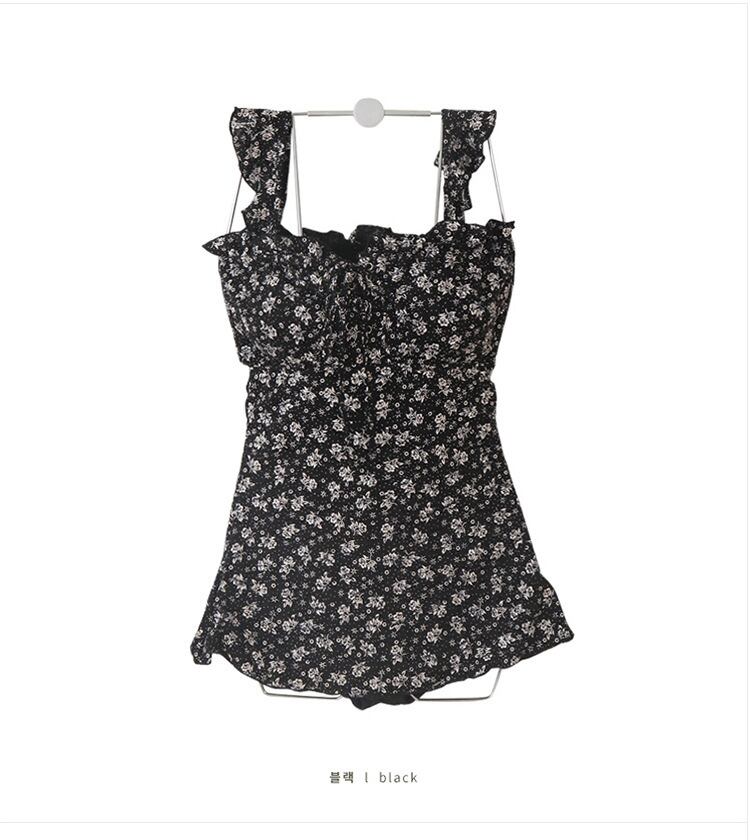 水着 ビキニ スイムウェア レディース ワンピース水着 モノキニ フリルショルダー パッド付き ノンワイヤー フリル シャーリング ウエストマーク かわいい セクシー 大人可愛い フェミニン 花柄 リゾート プール 海 夏 体型カバー スタイルアップ 背中見せ 韓国 M L XL 黒 ブラック