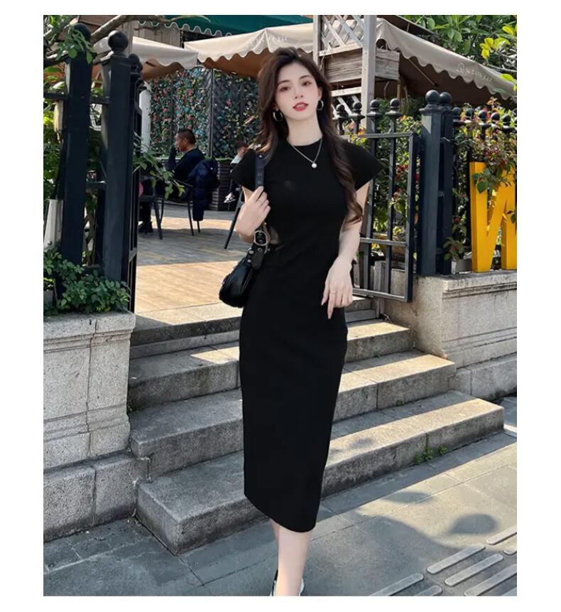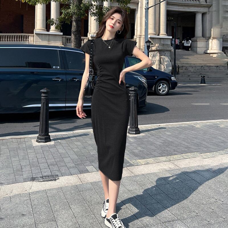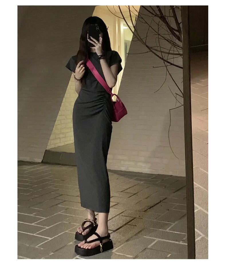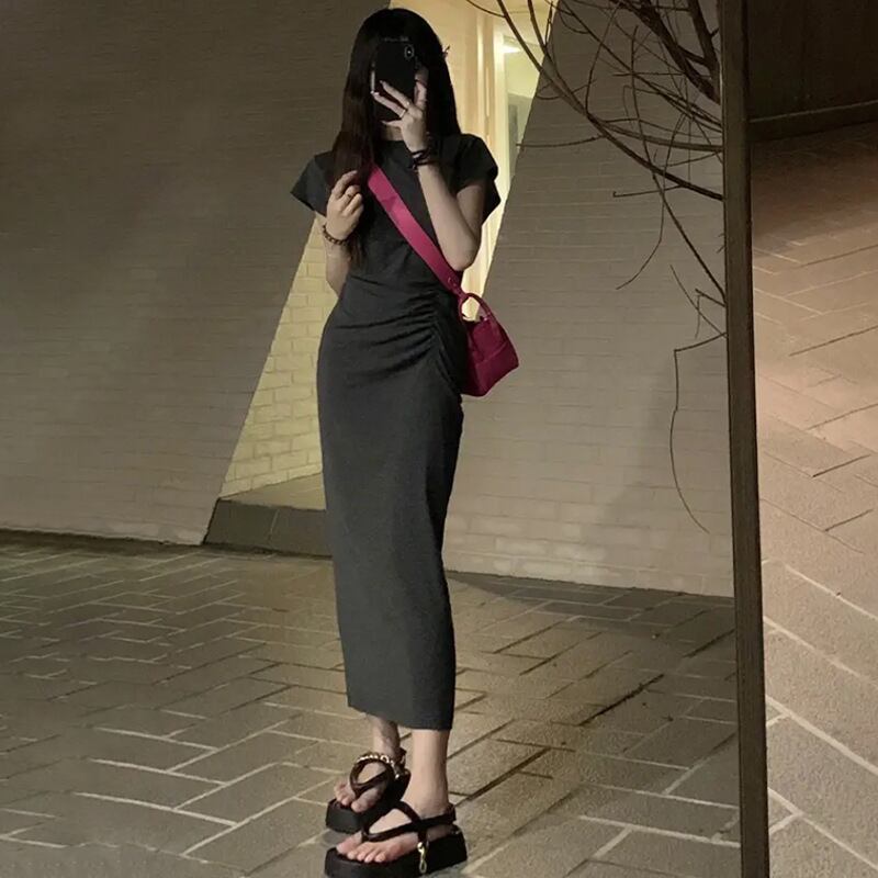 レディース ワンピース タイトワンピ ロング 半袖 ラウンドネック タイト スリム ウエストマーク ボディコン きれいめ エレガント 大人可愛い おしゃれ 無地 夏 20代 30代 40代 デート お出かけ オフィス 通勤 女子会 休日 ショッピング 体型カバー 美脚 着回し トレンド S M L XL 2XL 黒 ブラック ダークグレー