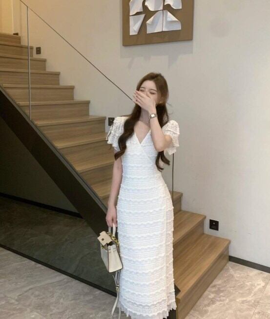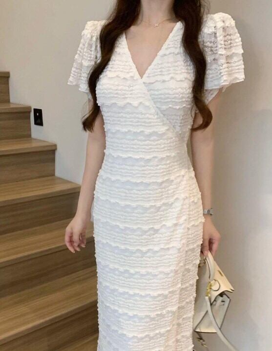 レディース ワンピース ストレートスカート ロング 半袖 Vネック タイト レース フリル ウエストマーク エレガント 上品 大人可愛い きれいめ 無地 春 夏 デート パーティー レストラン 女子会 20代 30代 40代 トレンド 清楚 モテ 着回し S M L XL 2XL ホワイト オフホワイト 黒 ブラック