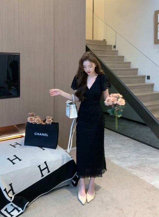 Vネックとレースのフリルが上品さを際立てるロングワンピース タイトなシルエットでスタイルアップ デートやパーティーなど特別なシーンを華やかに彩る一着