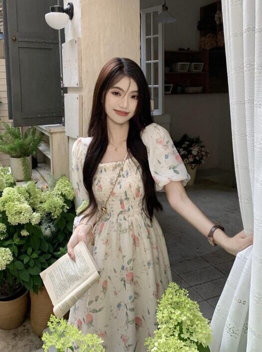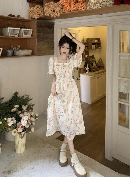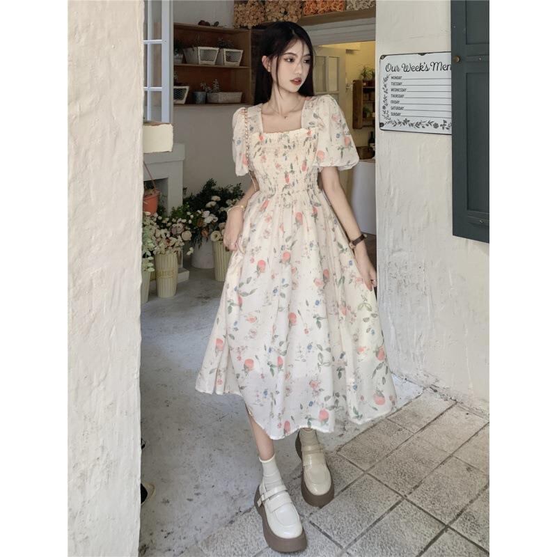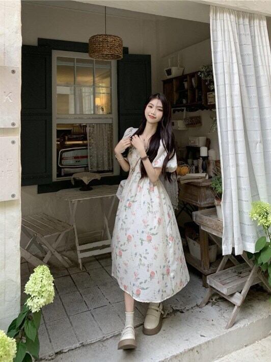 小さな花柄が散りばまれたフレンチロマンティックなロングワンピース。パフスリーブとスクエアネックで女性らしい上品な印象を演出します。ハイウエストのAラインシルエットが脚長効果を叶え、春夏のお出かけやカフェ、デートシーンにぴったりの一枚です。