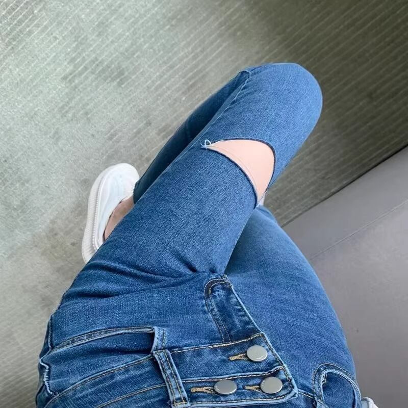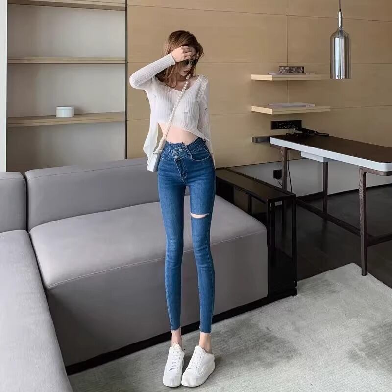 ハイウエストでスタイルアップ 膝にホールデザインがトレンド感を演出するクロップドデニムパンツ ストレッチ素材でスッキリとしたシルエットを叶え デートからショッピングまで幅広く活躍します