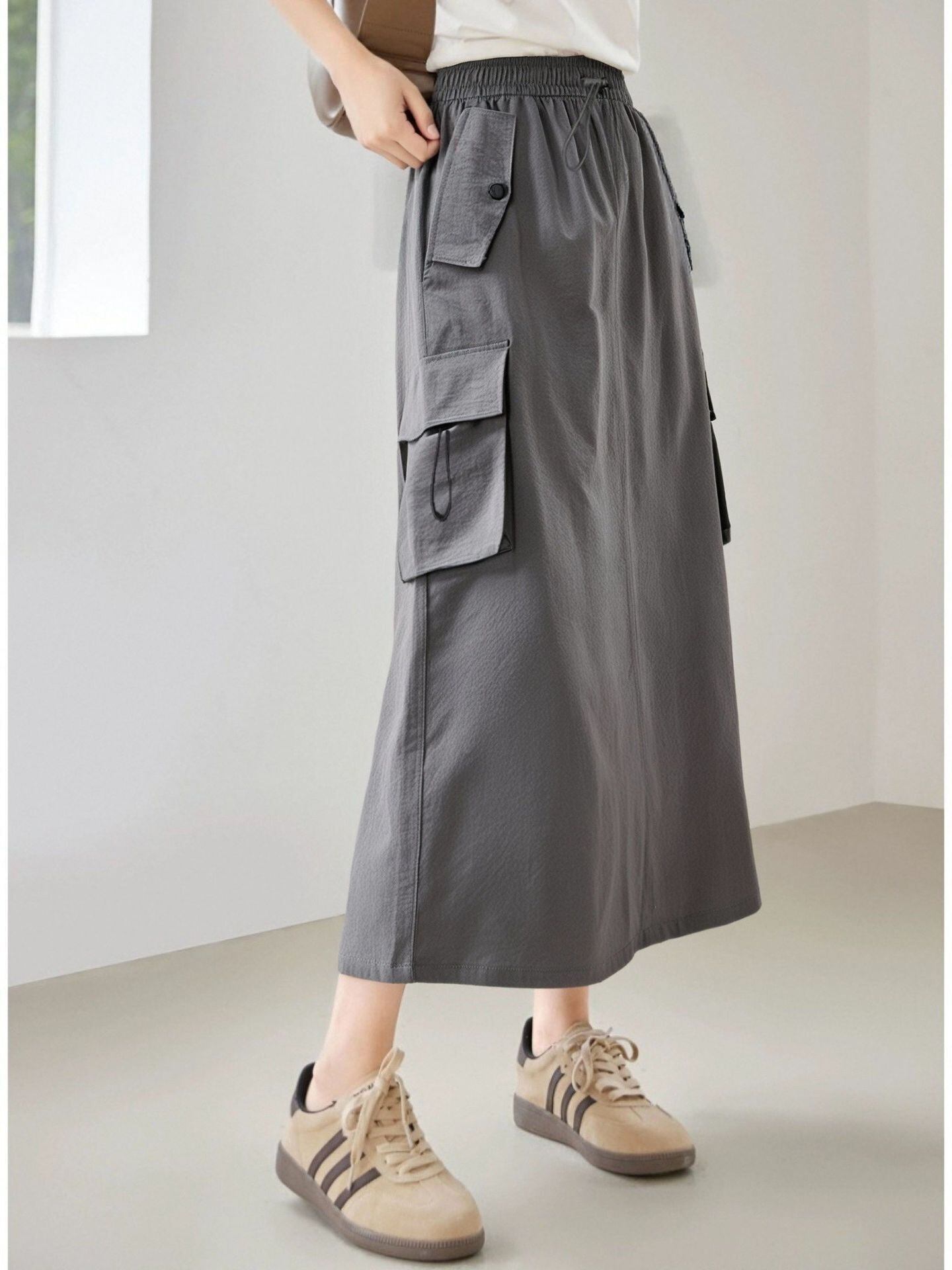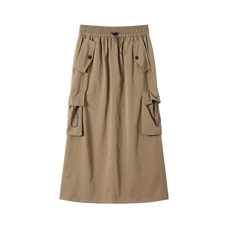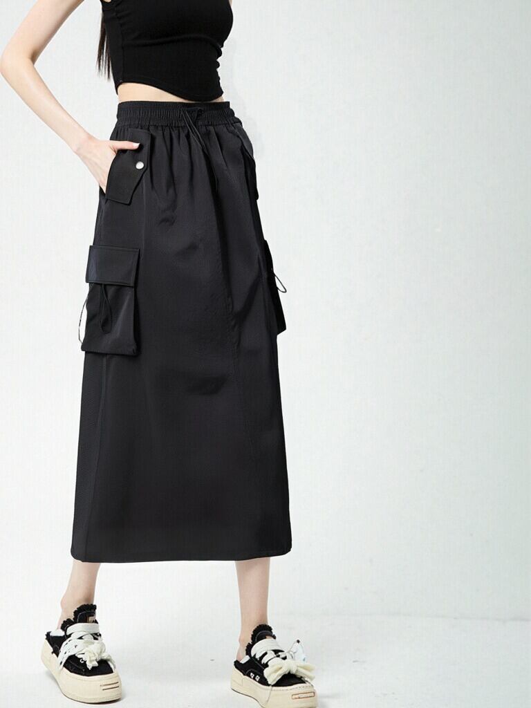 ウエストゴムで履き心地抜群のロング丈カーゴスカート。たっぷりポケットが付いた実用的なデザインで、カジュアルからきれいめコーデまで幅広く活躍。ブラック・グレー・カーキ・ホワイトの4色展開で着回し力も抜群です。