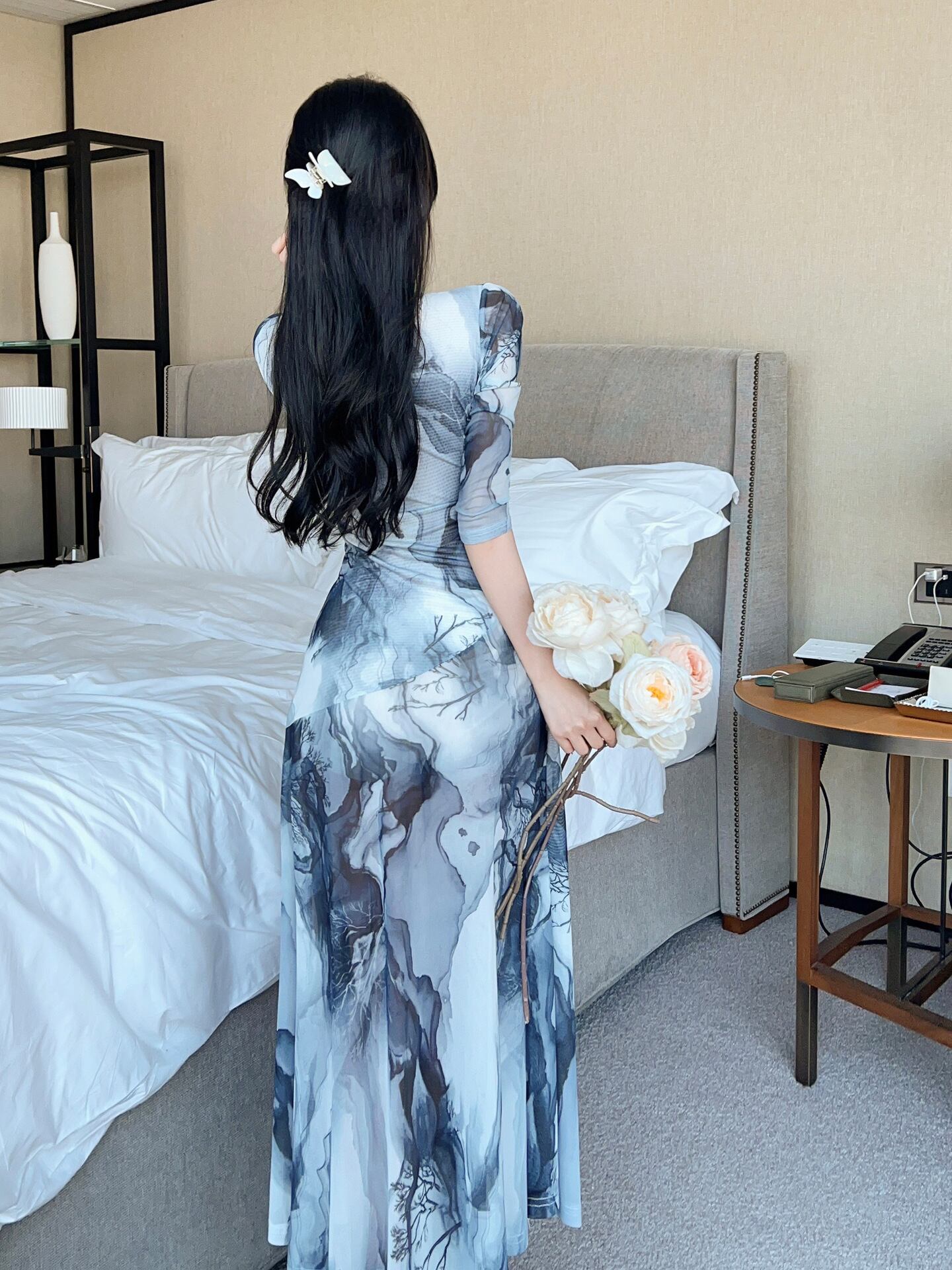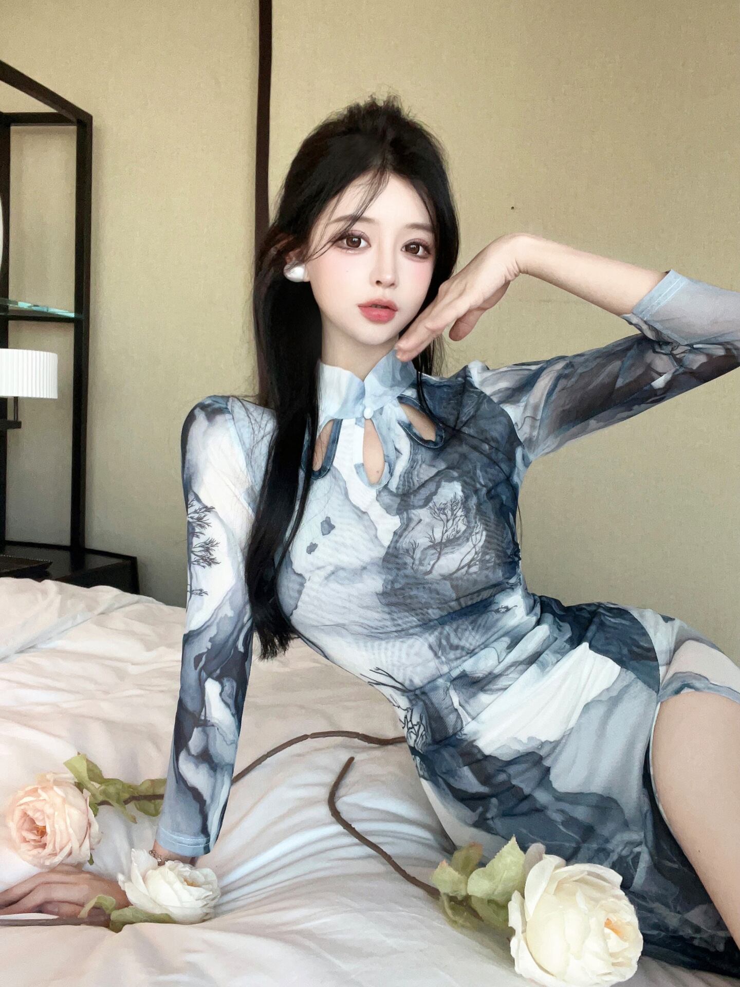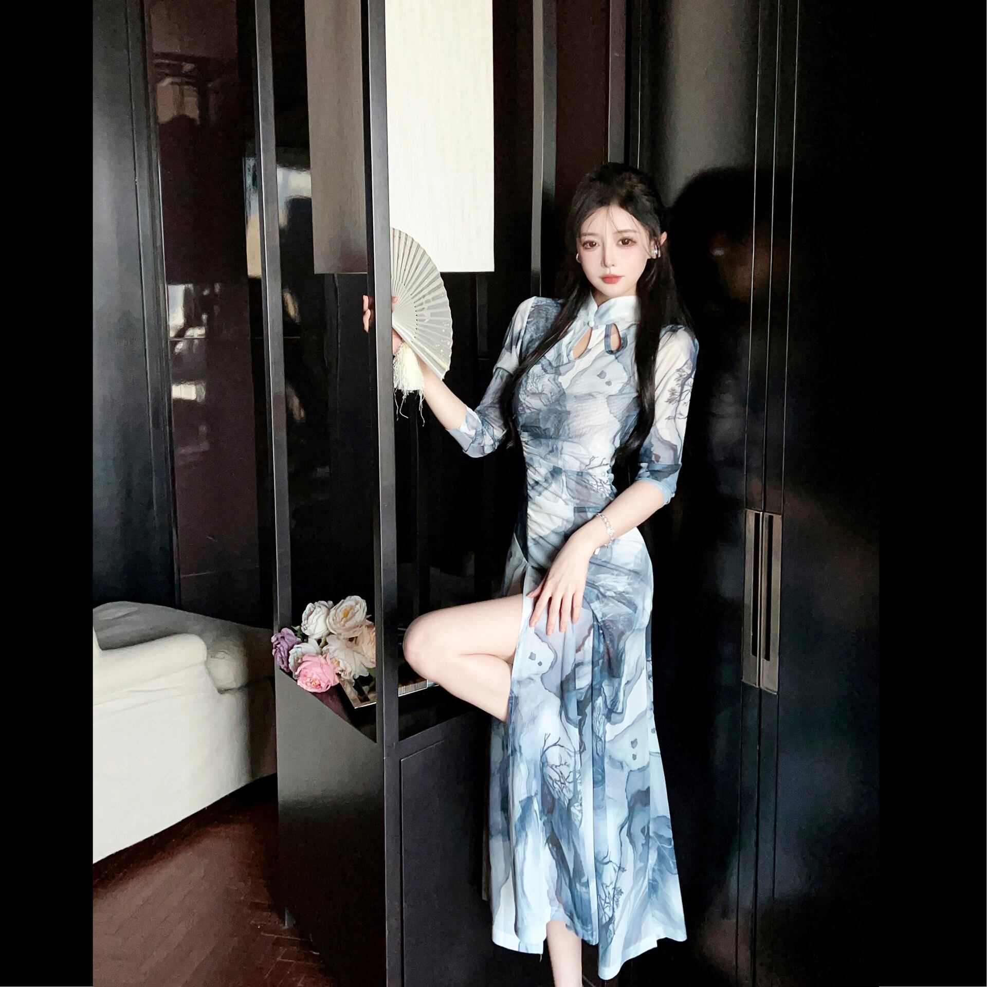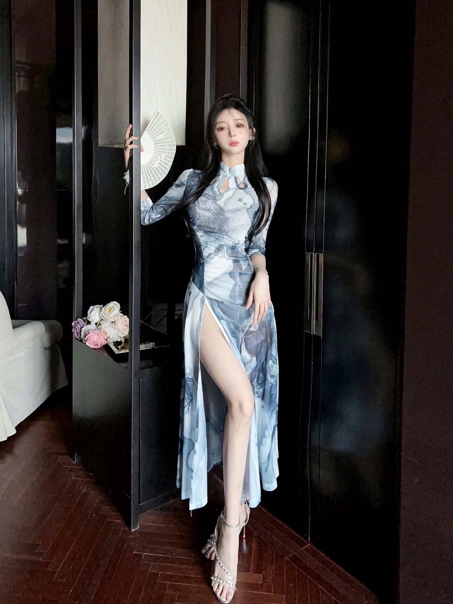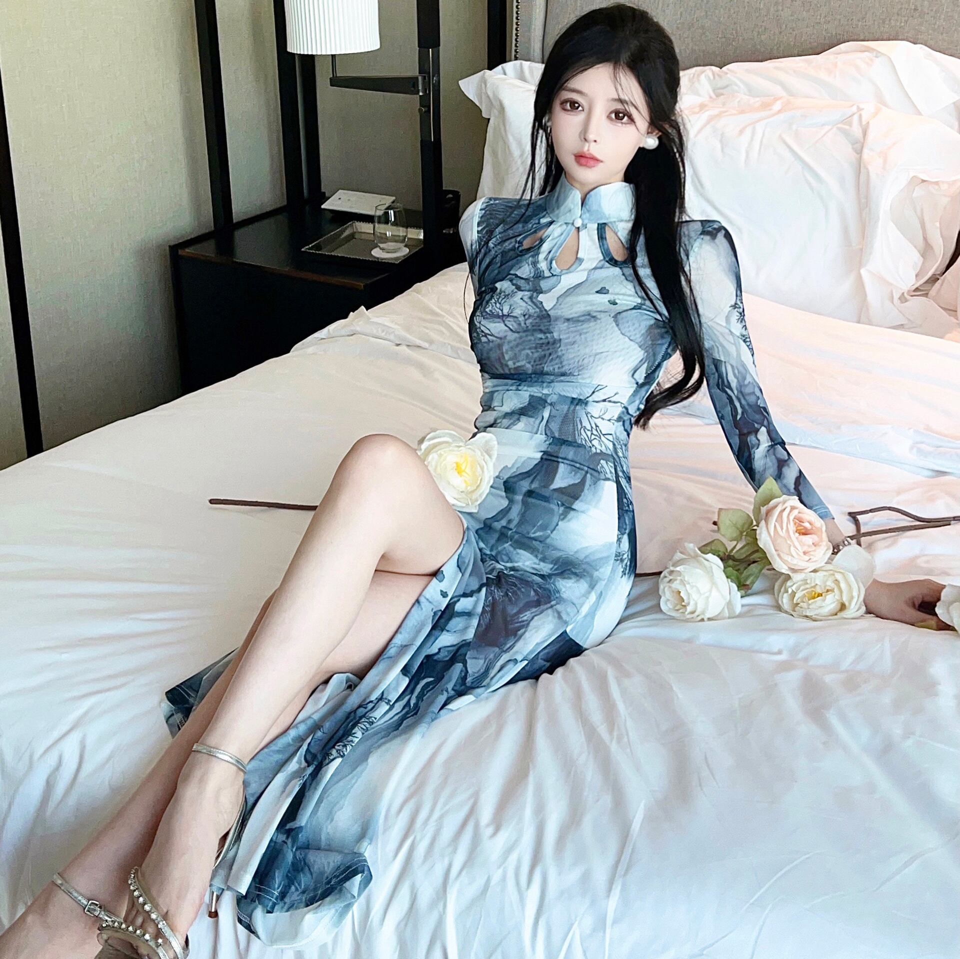 スタンドカラーとスリットが美しい旗袍デザインのロングワンピース。ウエストマークのスリムフィットシルエットが女性らしい曲線を引き立て、スタイルアップ効果も抜群。落ち着いたグレーのプリント柄はデートやレストランなど上品に決めたいシーンにぴったりです。