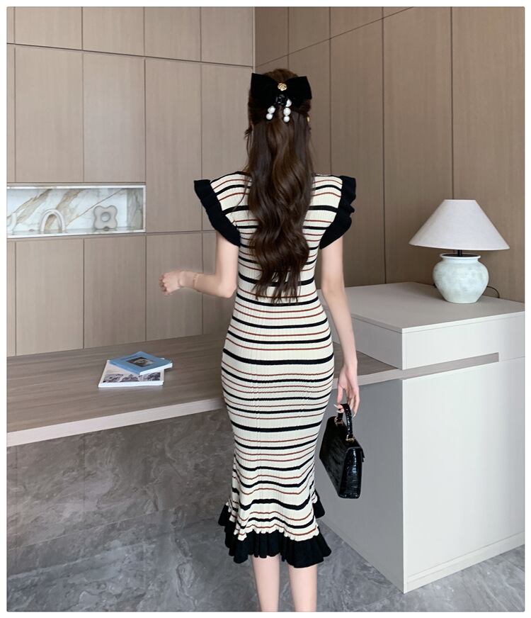 ストライプ×フリルのニットワンピース。ノースリーブのスッキリとしたデザインにリボンとフリルのアクセントが女性らしさを引き立てます。タイトシルエットでスタイルアップ効果も抜群。デートや女子会などさまざまなシーンに活躍します。