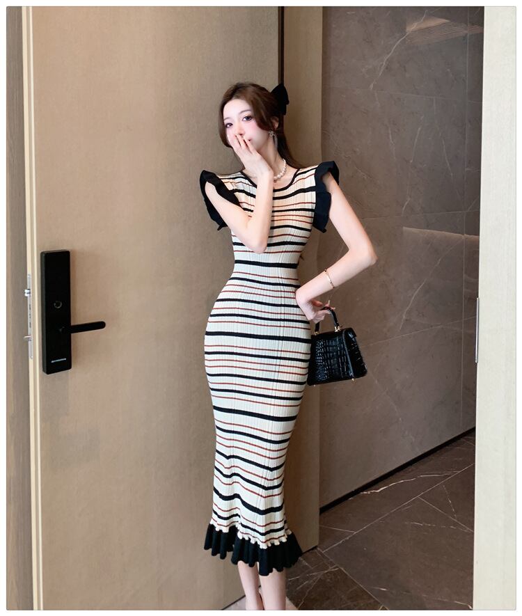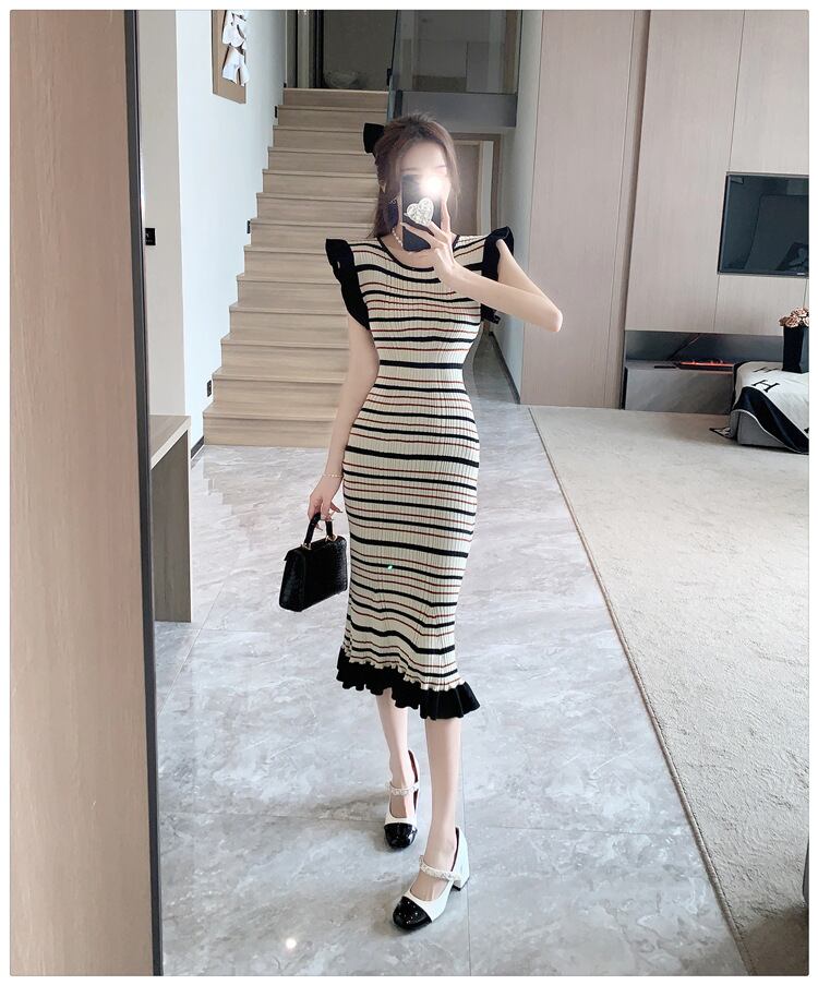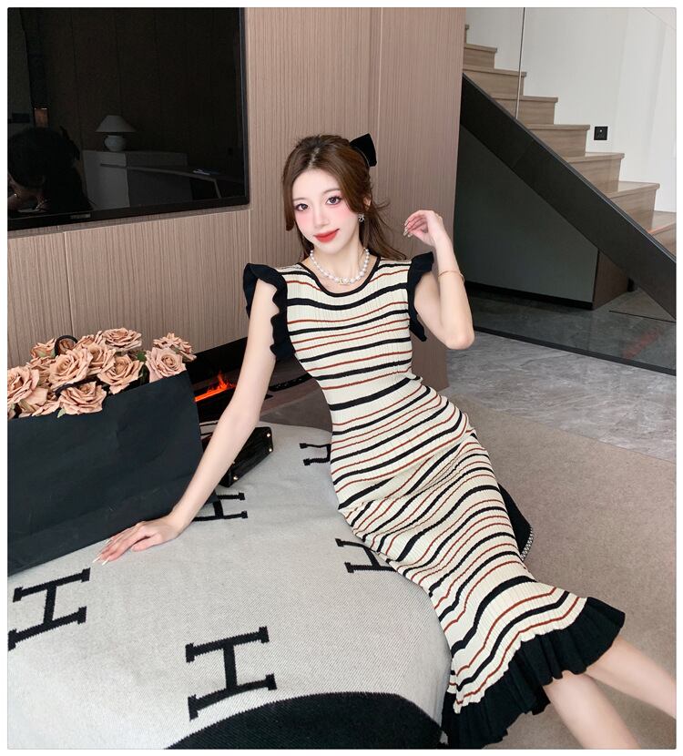 レディース ニットワンピース ロング 袖なし ラウンドネック タイト ストライプ フリル リボン ニット 大人可愛い きれいめ おしゃれ エレガント ストライプ柄 夏 春 20代 30代 40代 デート お出かけ パーティー 女子会 韓国 トレンド 体型カバー 着回し S M L ベージュ クリーム ブラック アイボリー アイボリーブラック