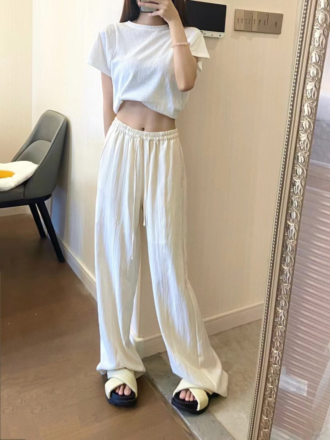 ふんわり広がるワイドシルエットが脚長効果を演出するロングパンツ。ドローストリングのウエストマークデザインで、すっきりとしたスタイルに仕上がります。カジュアルからきれいめまで幅広く着回せる万能アイテムです。