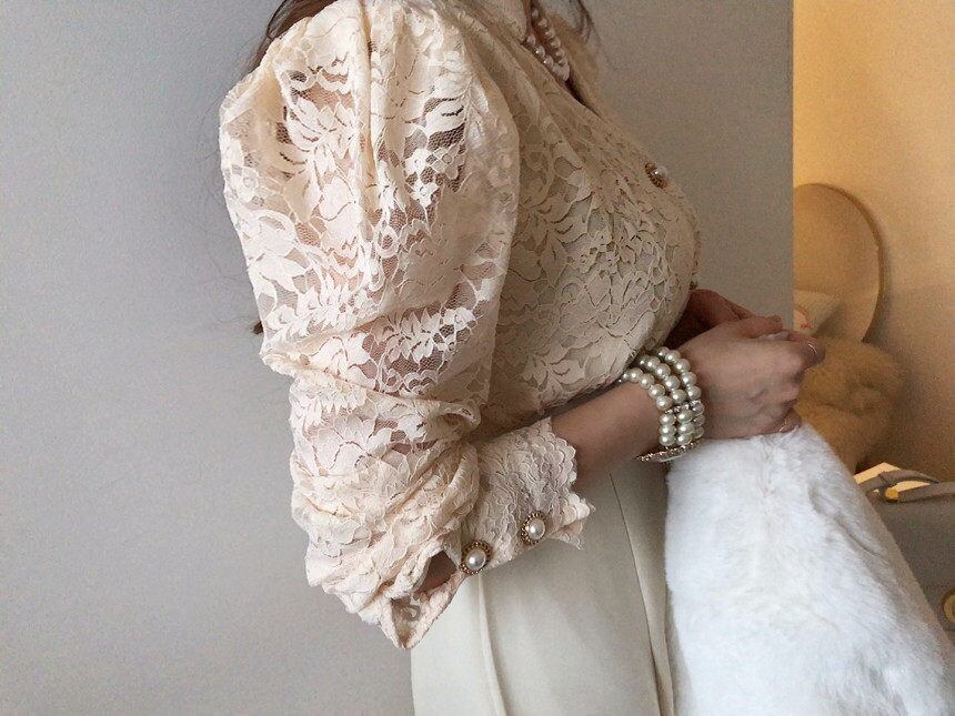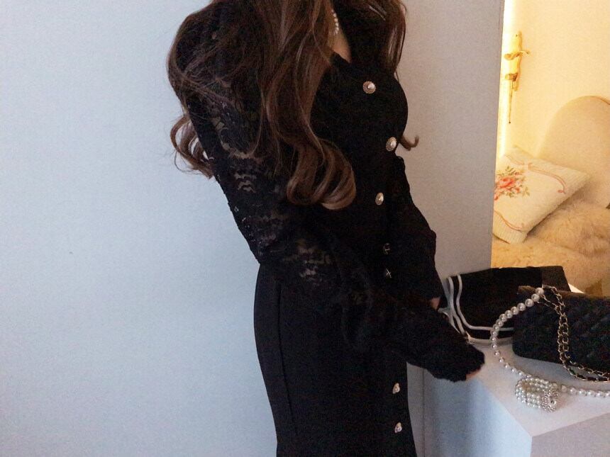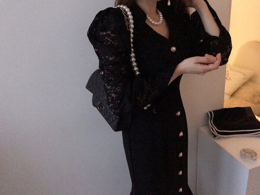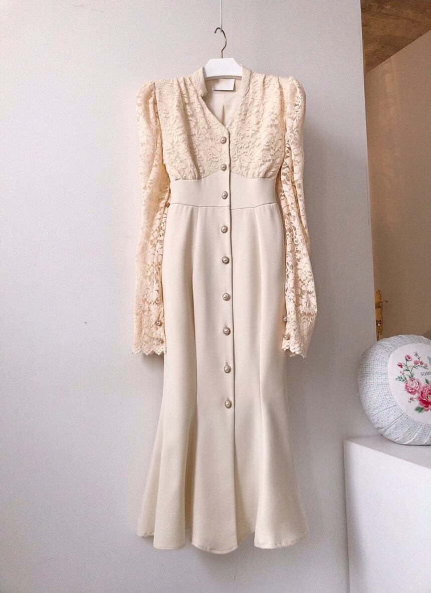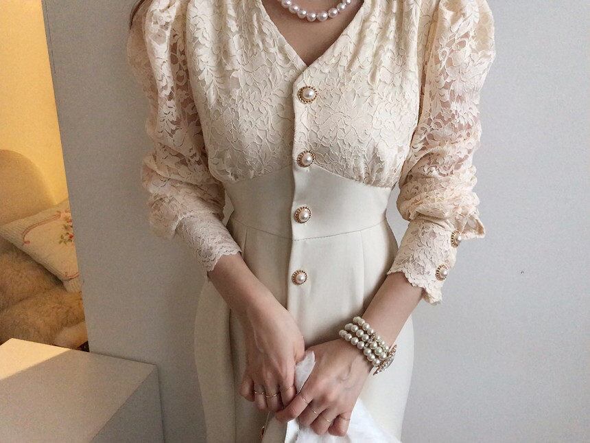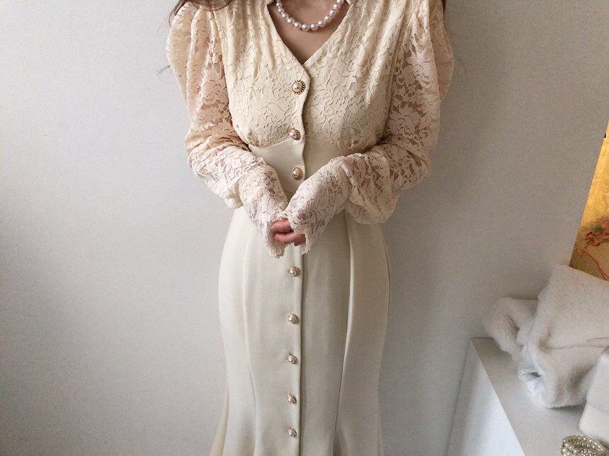 繊細なレースとVネックデザインが女性らしさを引き立てる上品なロングワンピース。縦に並ぶボタンとハイウエストラインで脚長効果を演出し、スラリとしたシルエットに仕上げます。デートやレストランなど大人の女性らしいシーンに映える一枚です。