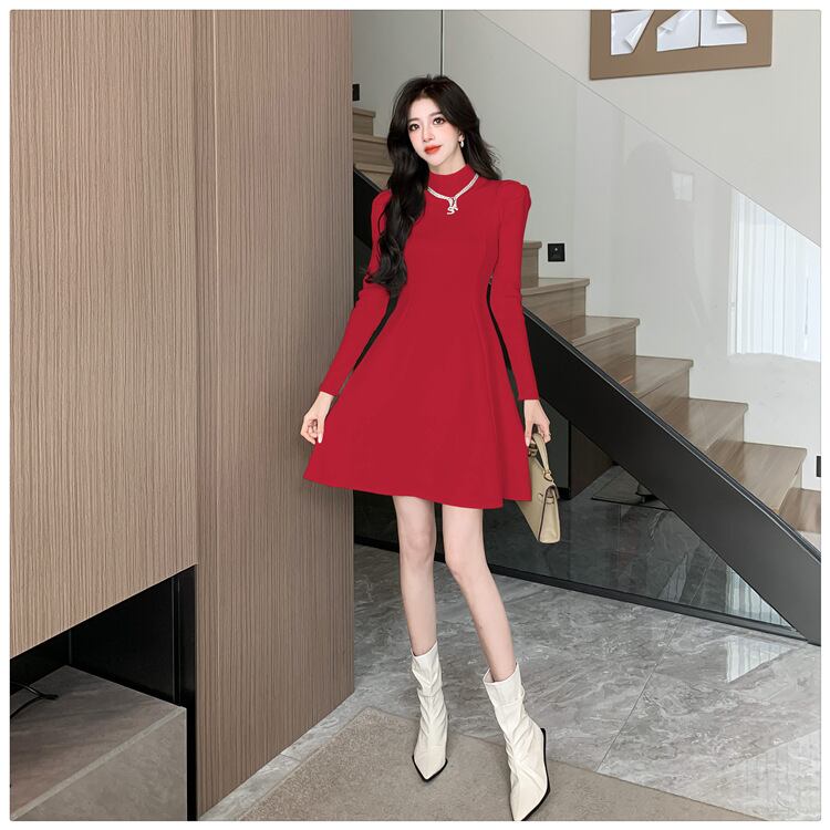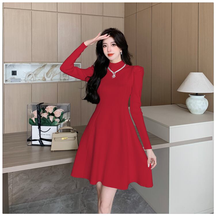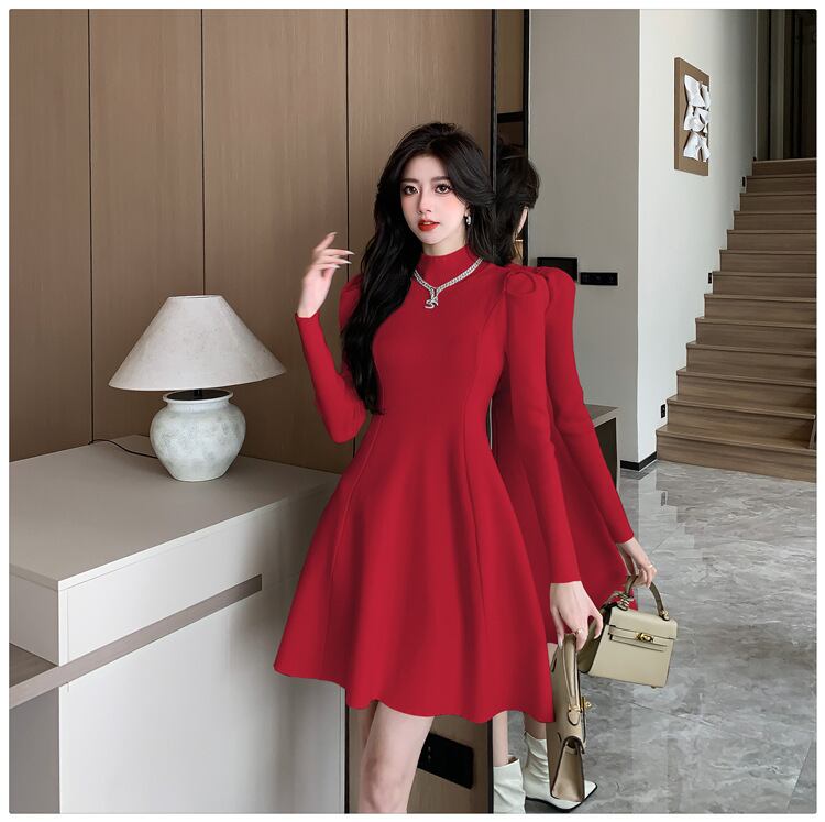 レディース ニットワンピース フレアワンピース ミディ丈 長袖 ハイネック セミタートルネック Aラインシルエット ウエストマーク フレア スカート ニット素材 エレガント 上品 大人可愛い きれいめ 無地 秋冬 20代 30代 40代 デート オフィス 女子会 お出かけ 韓国 体型カバー 着回し S M L 黒 ブラック レッド アイボリー アプリコット 茶色 ブラウン