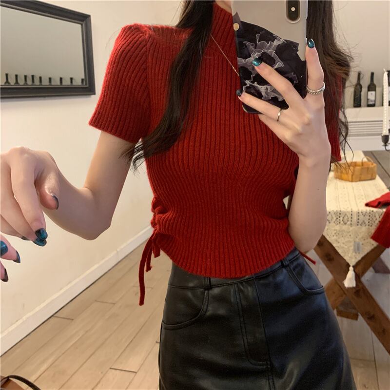 レディース トップス ニット アームカバー付き ショート丈 半袖 ハーフハイカラー スリム リブニット アームウォーマー 大人可愛い きれいめ おしゃれ こなれ感 無地 秋 冬 20代 30代 40代 デート お出かけ カフェ 女子会 韓国 トレンド 着回し 暖かい フリーサイズ 赤 黒 ブラック グレー レッド アプリコット