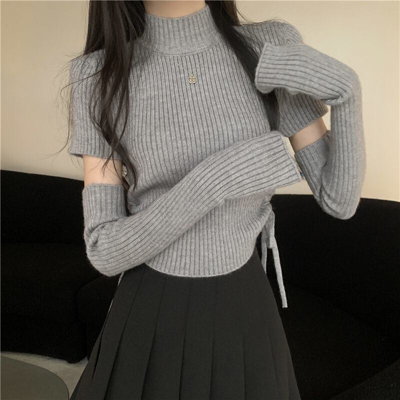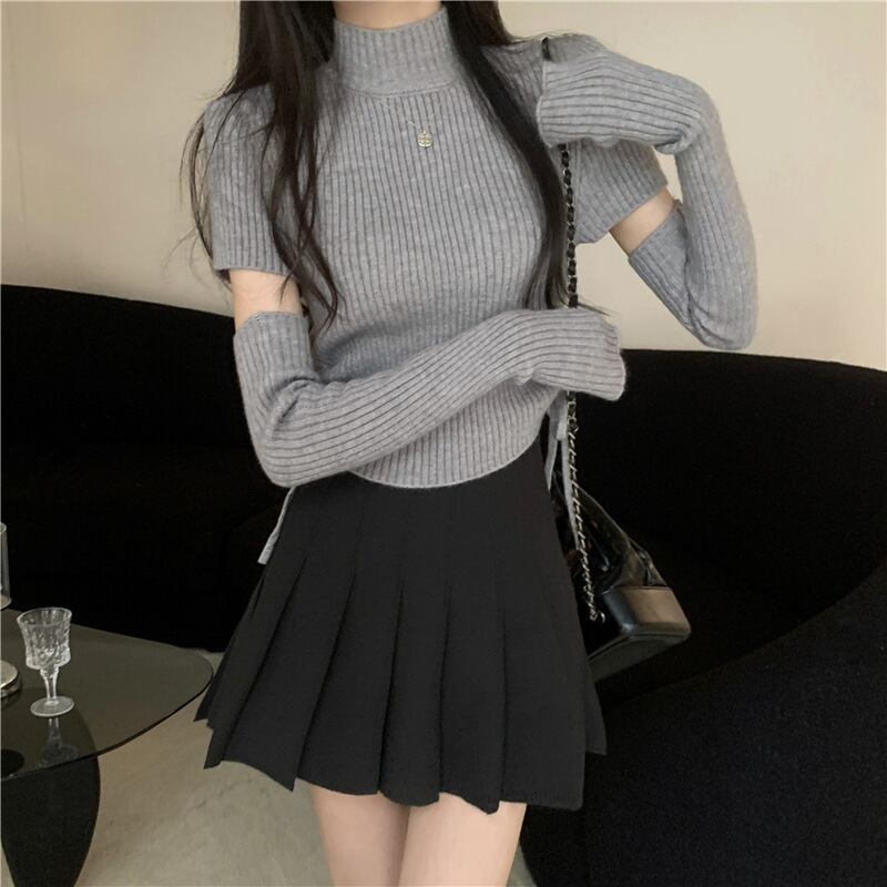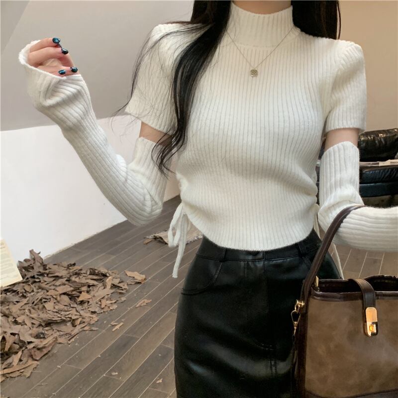 半袖ニットに同色アームカバーが付いた今季注目のセットデザイン 首元をすっきり見せるハーフハイカラーとスリムなリブ素材がスタイルアップを演出 カフェやデートはもちろん秋冬のお出かけスタイルに活躍する一枚