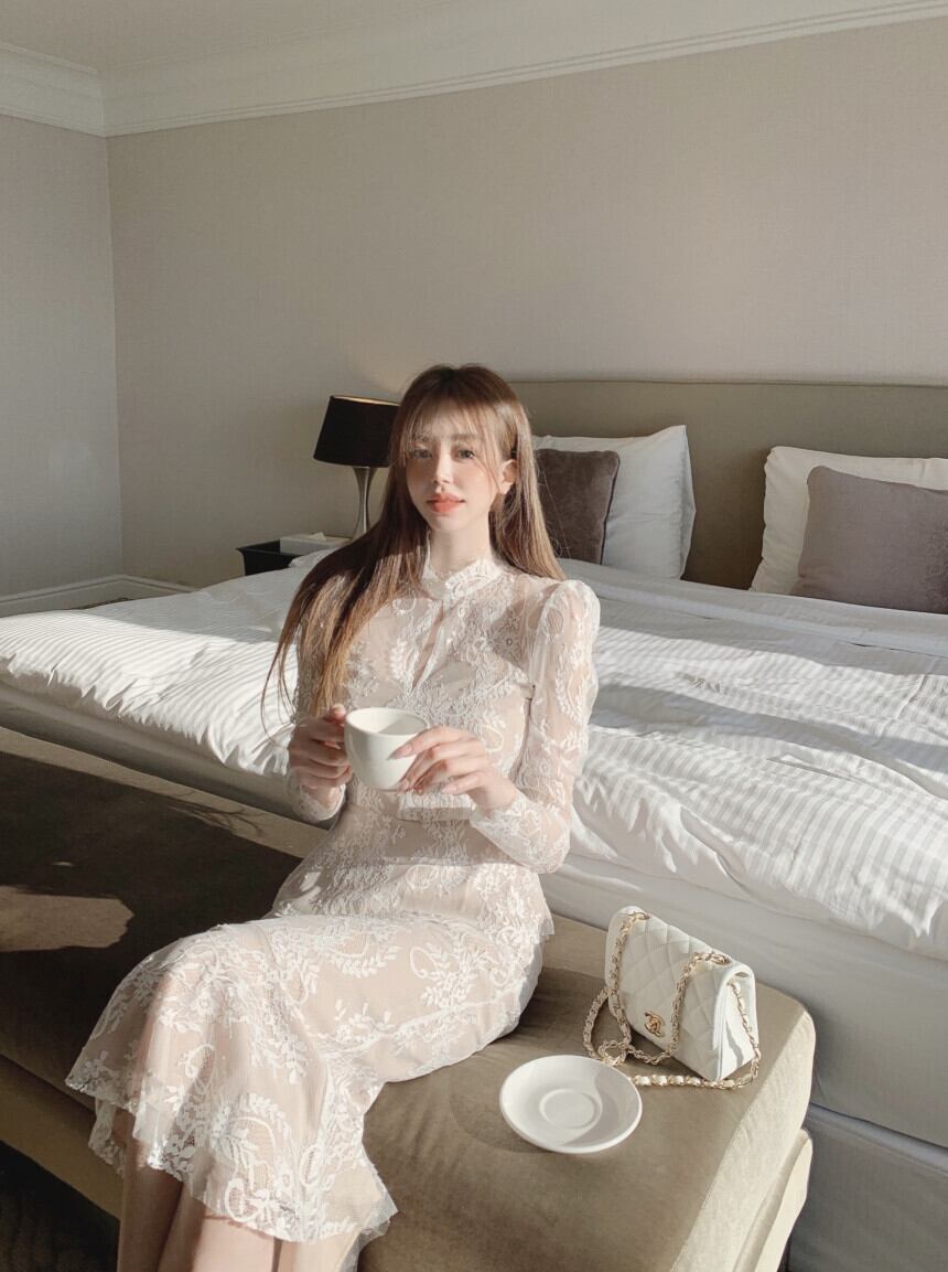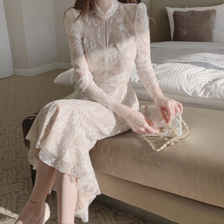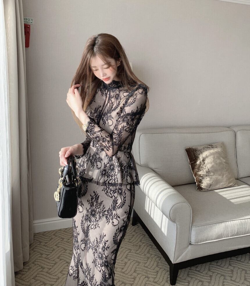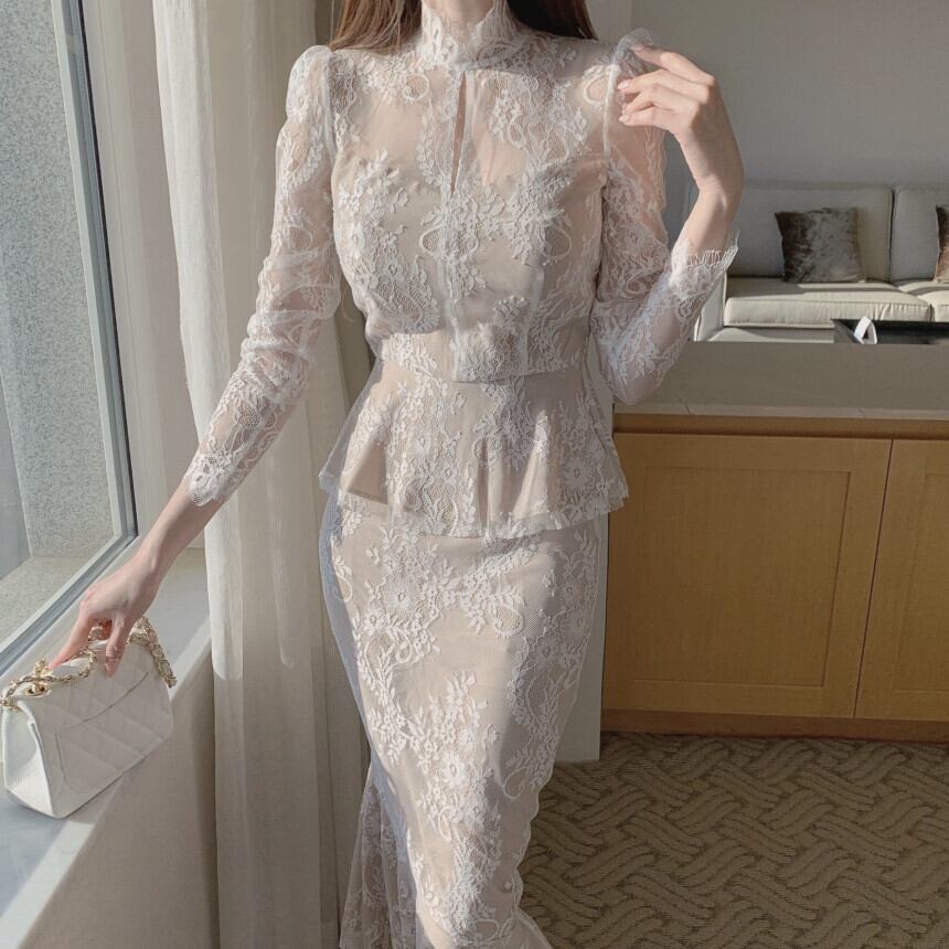 透け感のあるレースが上品な印象を演出するスタンドカラーのセットアップスーツ。フックデザインのトップスとマーメイドラインのロングスカートが女性らしいシルエットを作り出します。デートやパーティーなど特別なシーンにぴったりの一枚です。