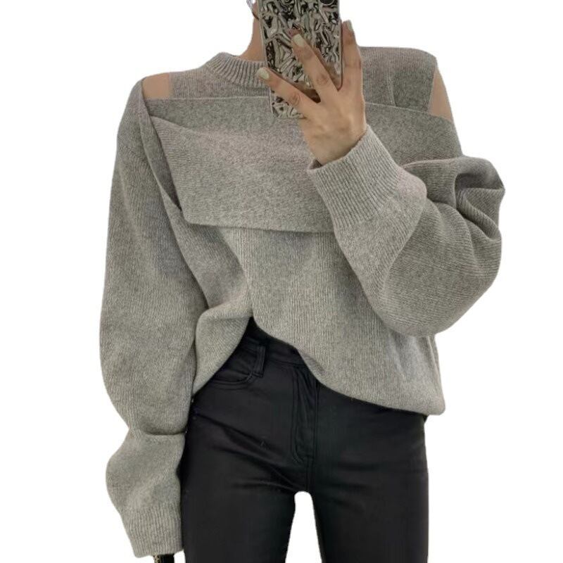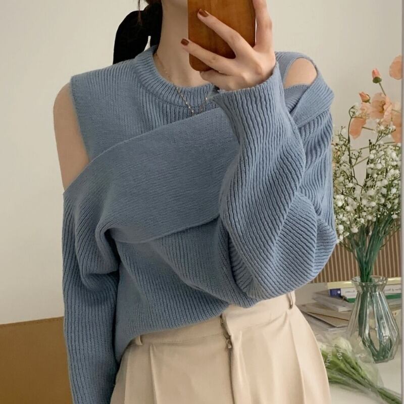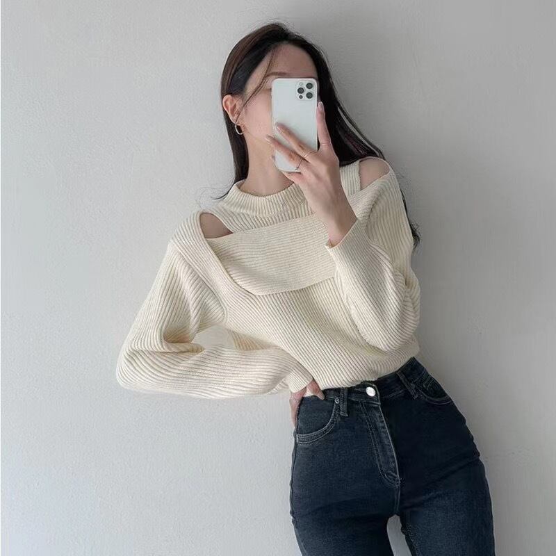 肩元のさりげないオープンデザインが今っぽい印象を演出するリブニットセーター