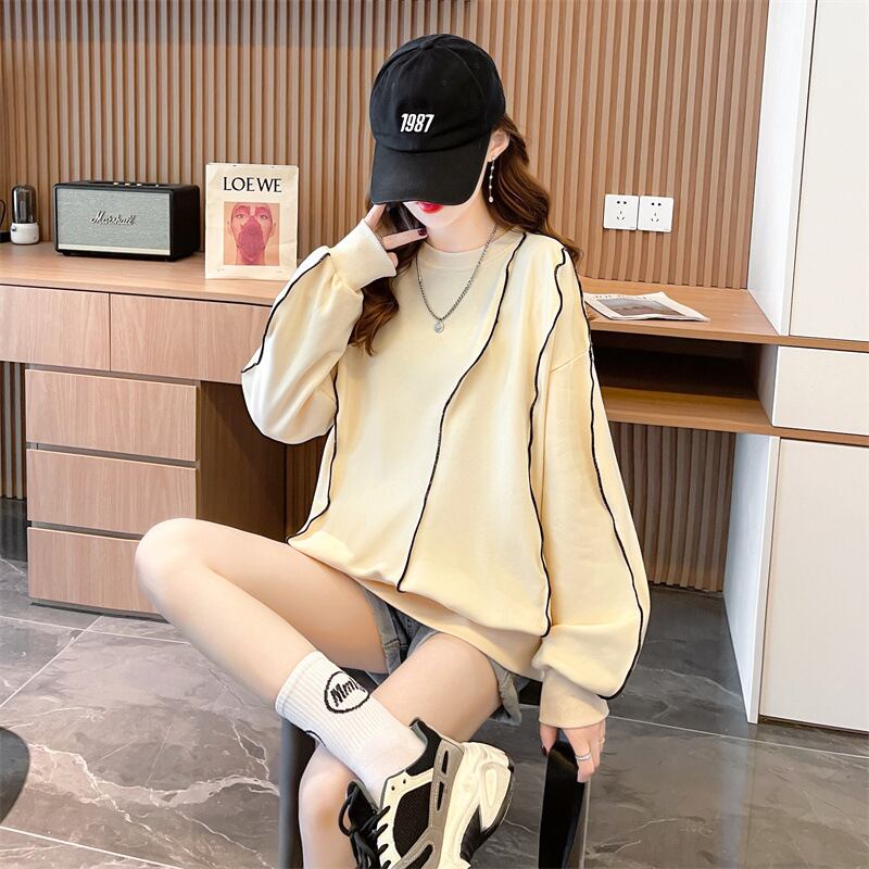 ロールネック風のラウンドネックにブラックのパイピングラインが映えるオーバーサイズスウェット コントラストラインがシンプルな無地コーデに程よいアクセントを添えてくれます ゆったりとしたシルエットで体型を問わず着こなせ 休日のお出かけやデートにぴったりの一枚です